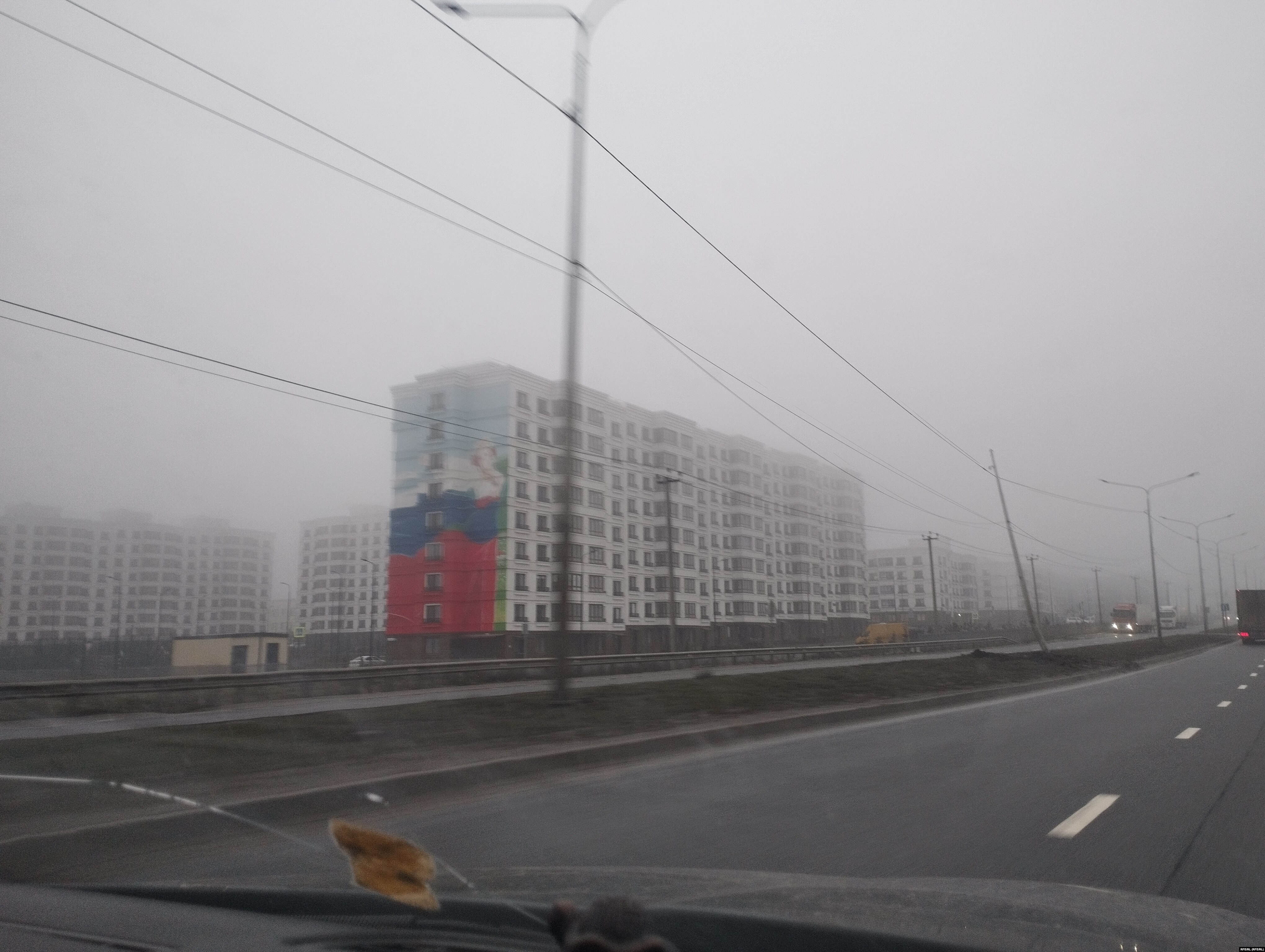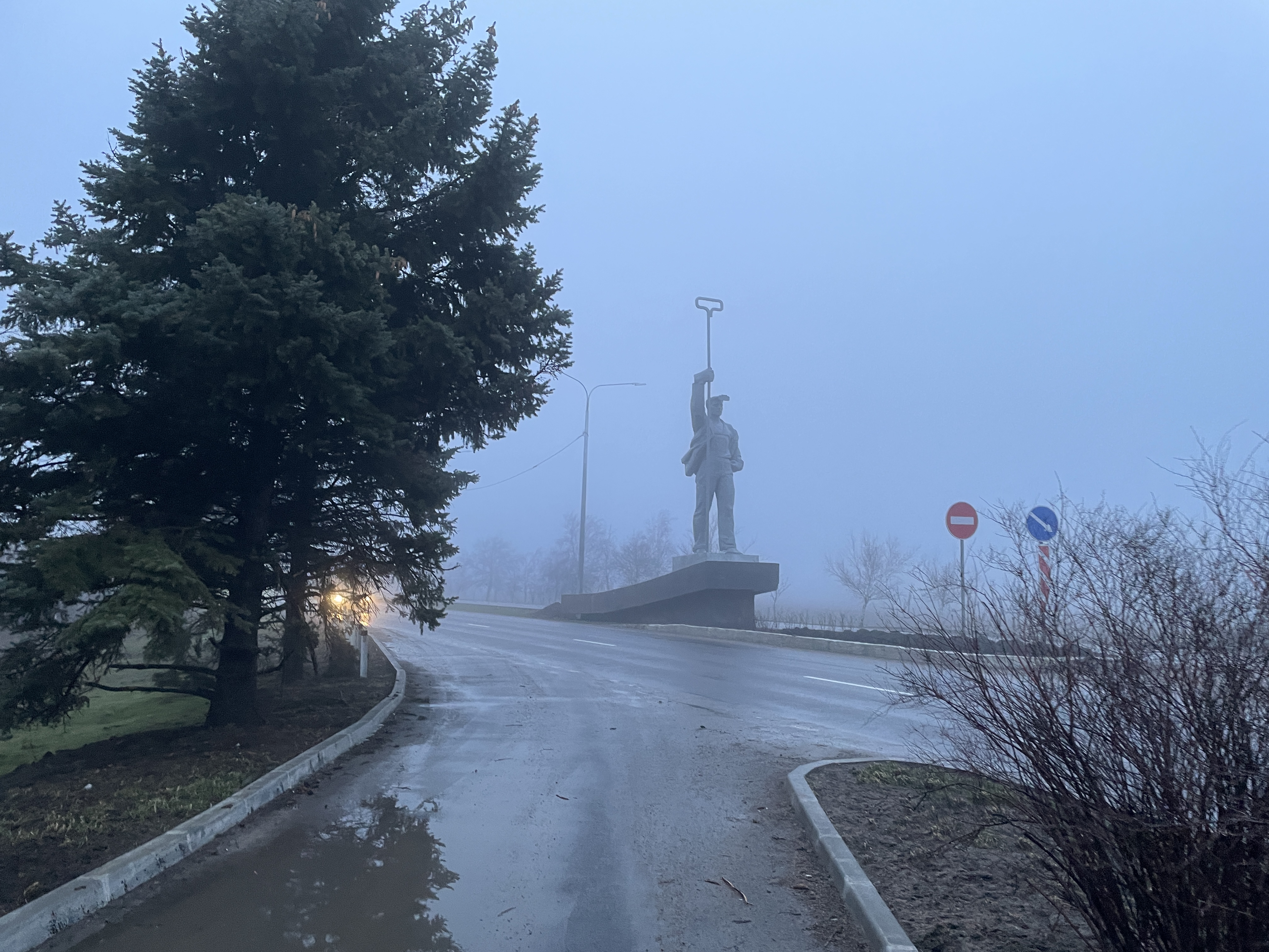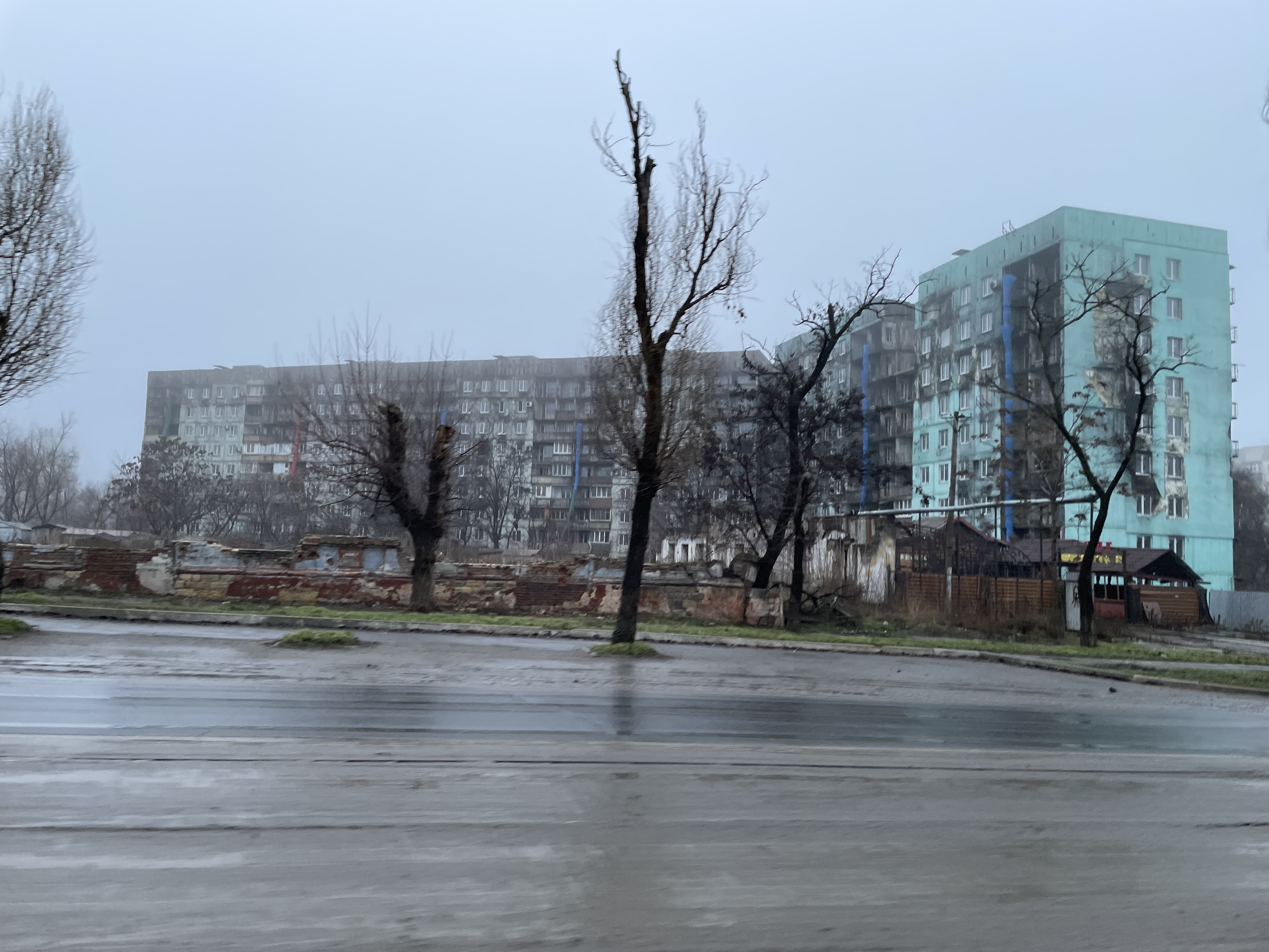 В конце января на город часто опускается туман, и в тумане Мариуполь выглядит еще более депрессивно: разрушенные и полуразрушенные здания, торговля на грязных рынках и разбитые, никому не нужные хозпостройки. Вокруг домов строительные заборы, то серые, то коричневые, то темно-зеленые.