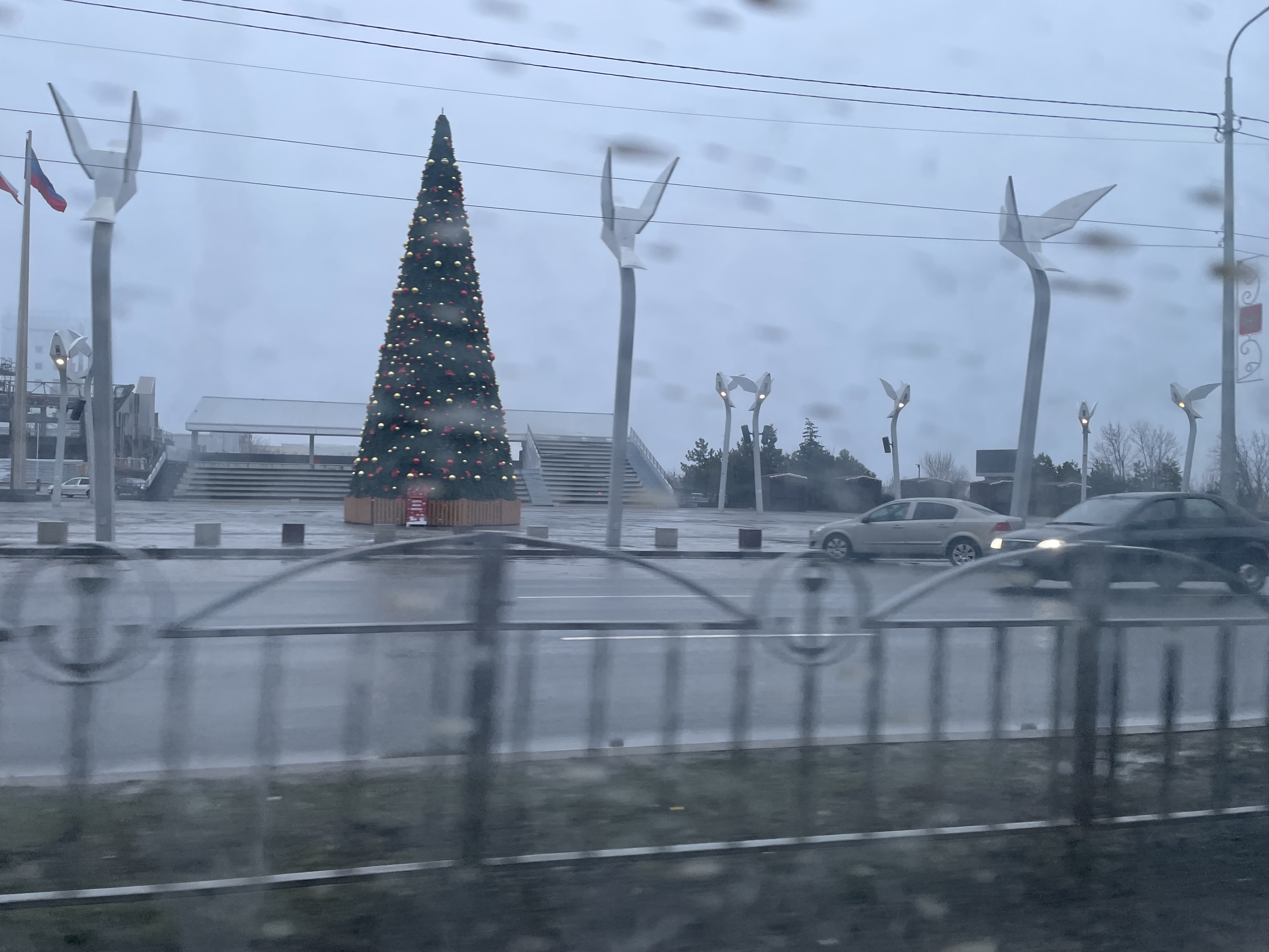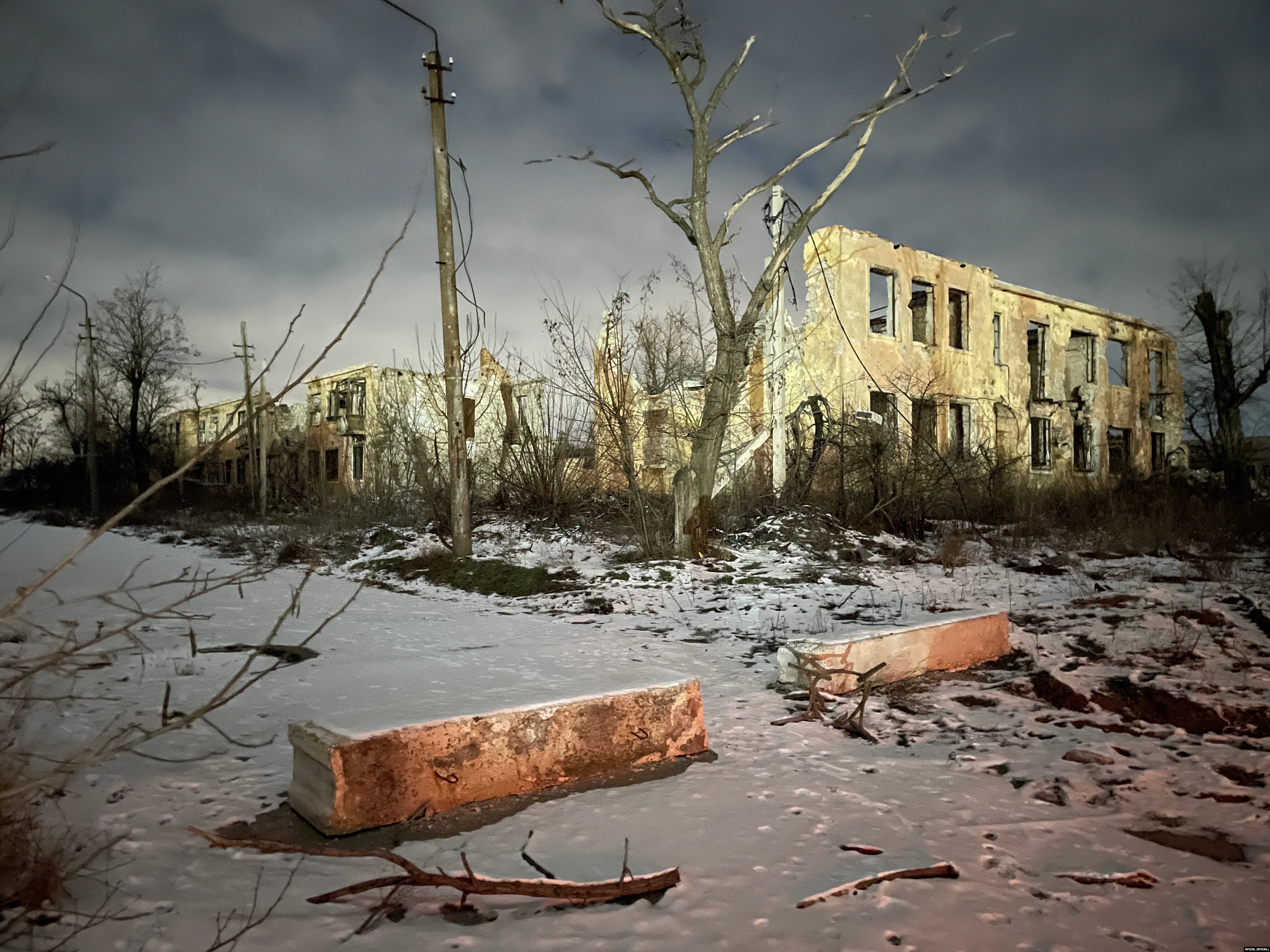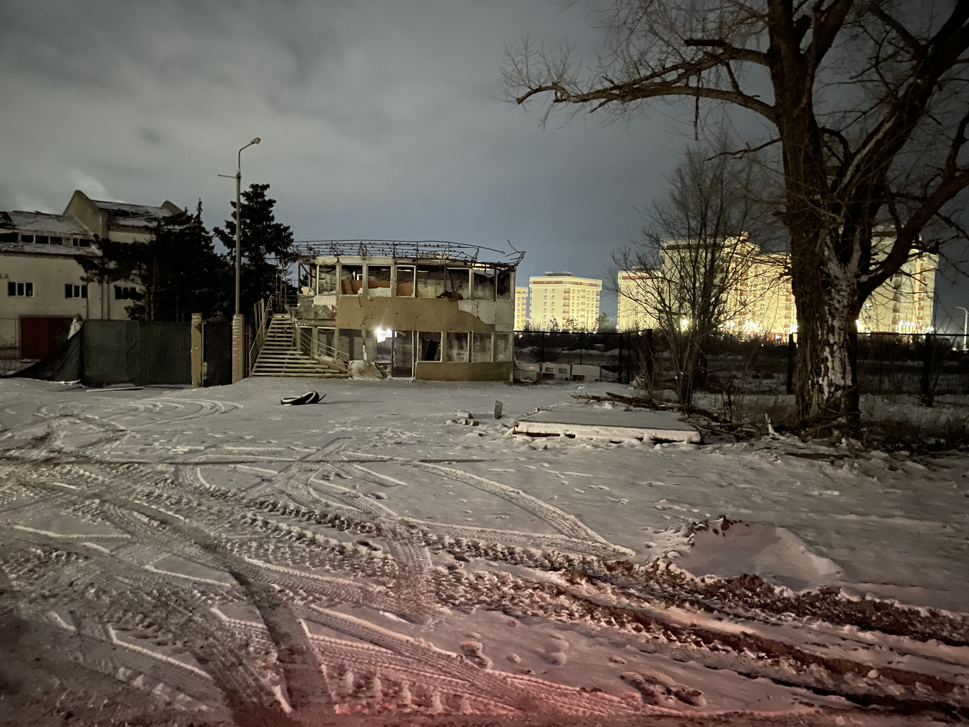 Улицы города практически пустые. Редко проезжают машины, пешеходов нет вообще. Вдоль центральных улиц, например проспекта Металлургов, стоят фонари, там ехать удобно. Если свернуть, то надо включать дальний свет – городского освещения уже не хватает. Освещены только новые дома, построенные Россией, но, как выяснилось, во многих никто не живет.