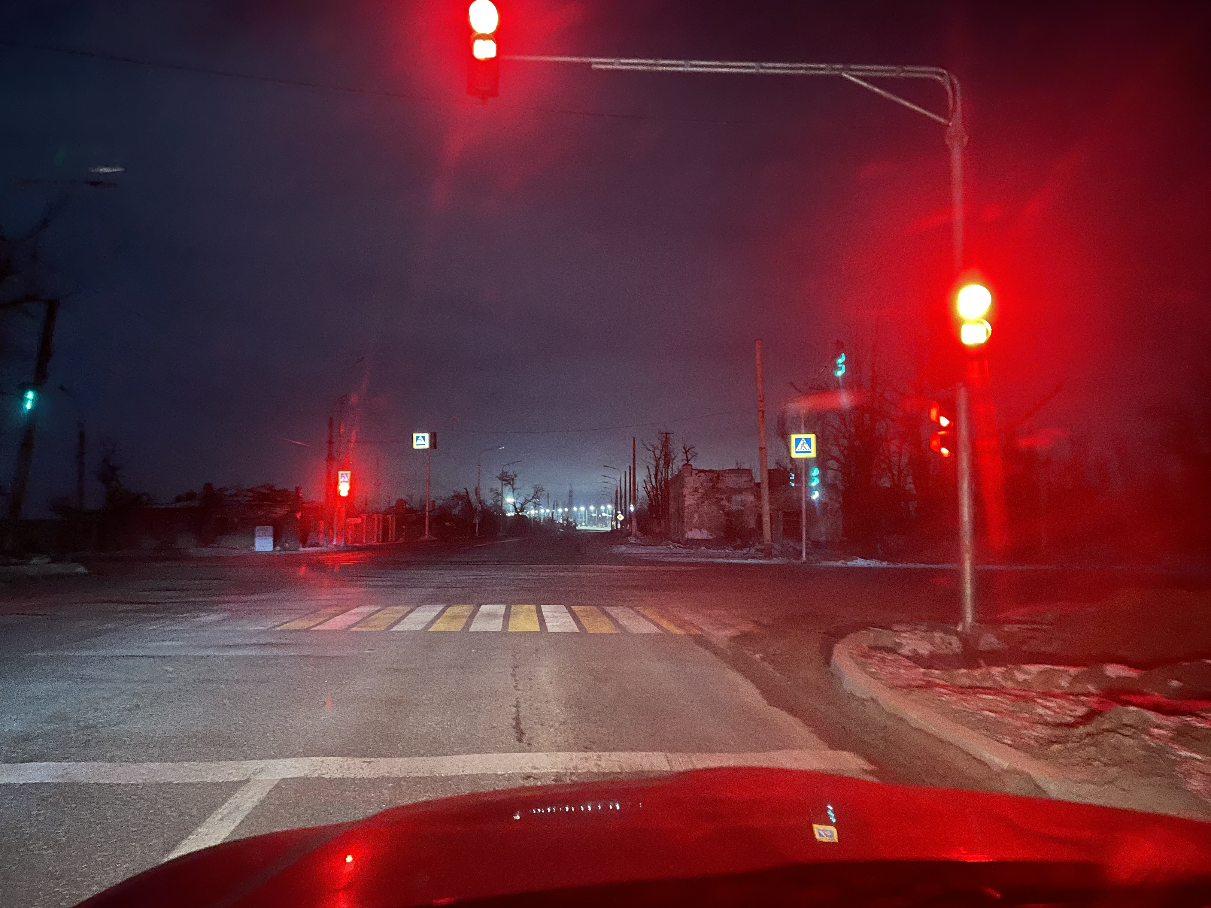 В Мариуполь, если ехать в темное время суток, въезжаешь незаметно для себя. В какой-то момент на пути появляется светофор. Это Левобережный район, наиболее пострадавший во время осады российскими и дэнээровскими войсками. Перекресток весь красный, проход только пешеходам, но их уже нет – приближается комендантский час. Рядом разрушенные здания.