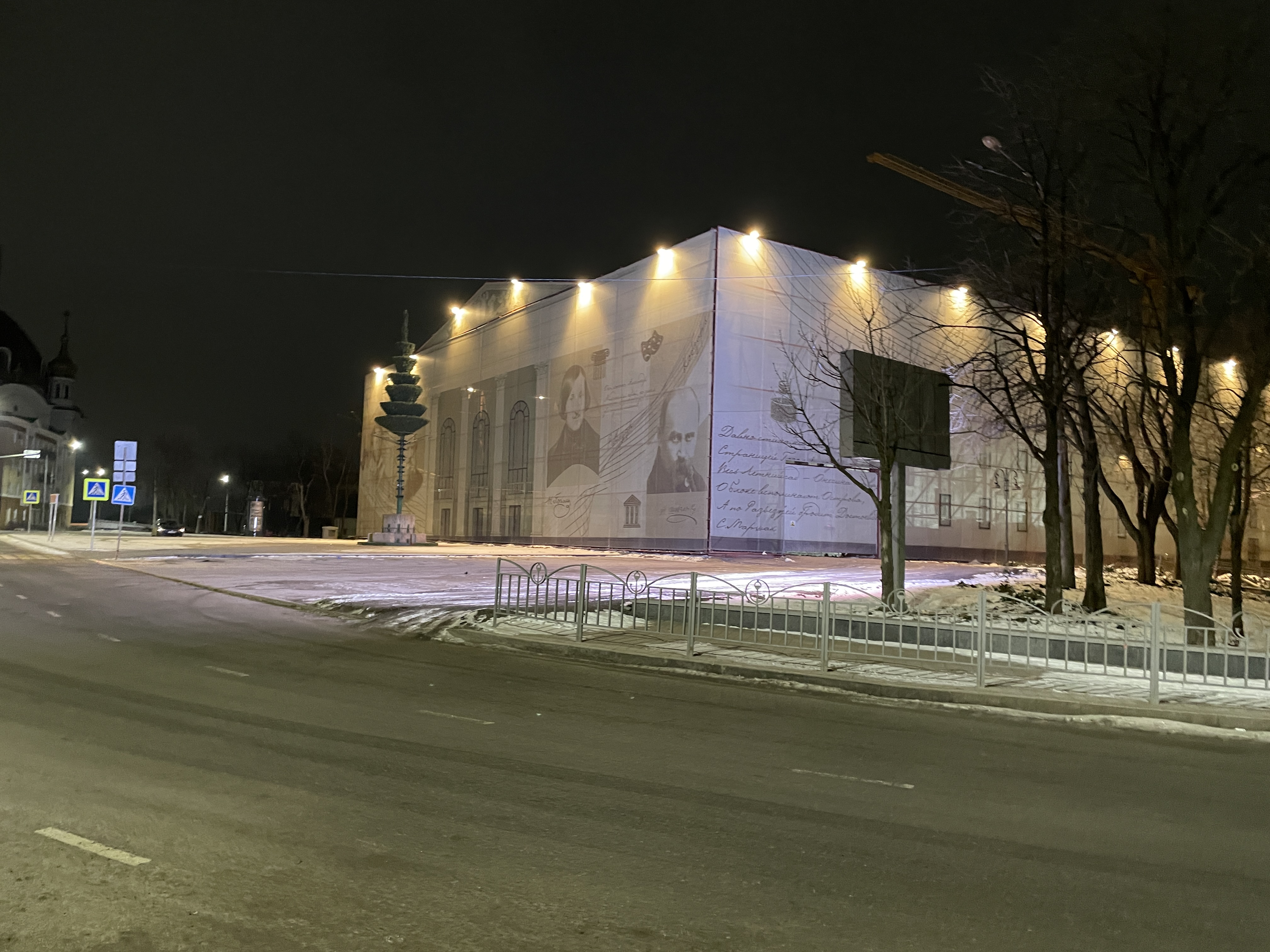 Российские войска уничтожили Донецкий областной драматический театр 16 марта 2022 года, сбросив на него авиационную бомбу. По разным данным, погибло от 300 до 600 человек. Сейчас от прежнего театра ничего не осталось. На его месте – тканевый фасад с изображениями и цитатами классиков литературы.
