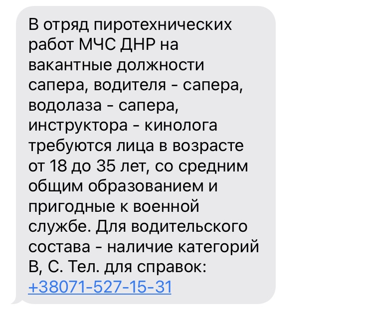 Оператор не обманула, вакансия и правда есть – водитель, пожарный, фельдшер в МЧС "ДНР", но в Макеевке (пригород Донецка).