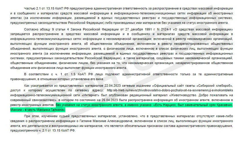 Нарушение закона сотрудница нашла в части заметки, посвященной свиньям: «Есть Нарцисс, был замечательный хряк Красавчик, Максим — в честь Максима Галкина». За это предложение Сидлярова составила на редакцию газеты административный протокол об отсутствии маркировки «иноагента» (часть 2.1. статьи 13.15 КоАП РФ).