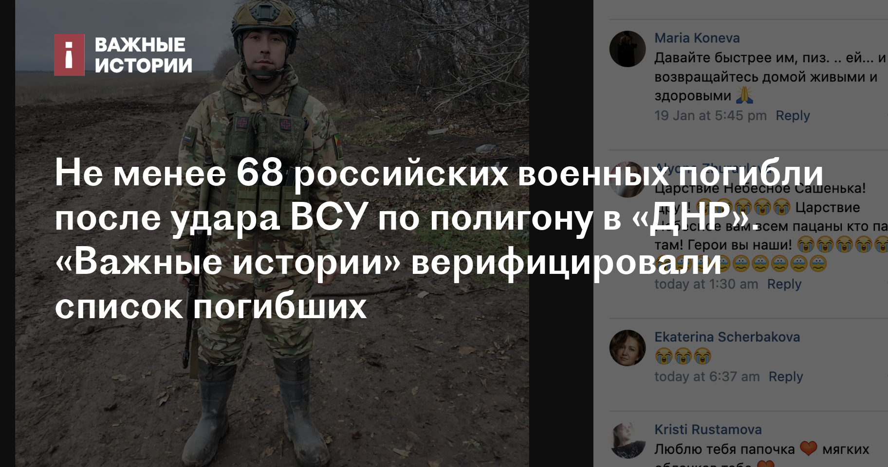 Не менее 68 российских военных погибли после удара ВСУ по полигону в «ДНР». «Важные истории» верифицировали список погибших
