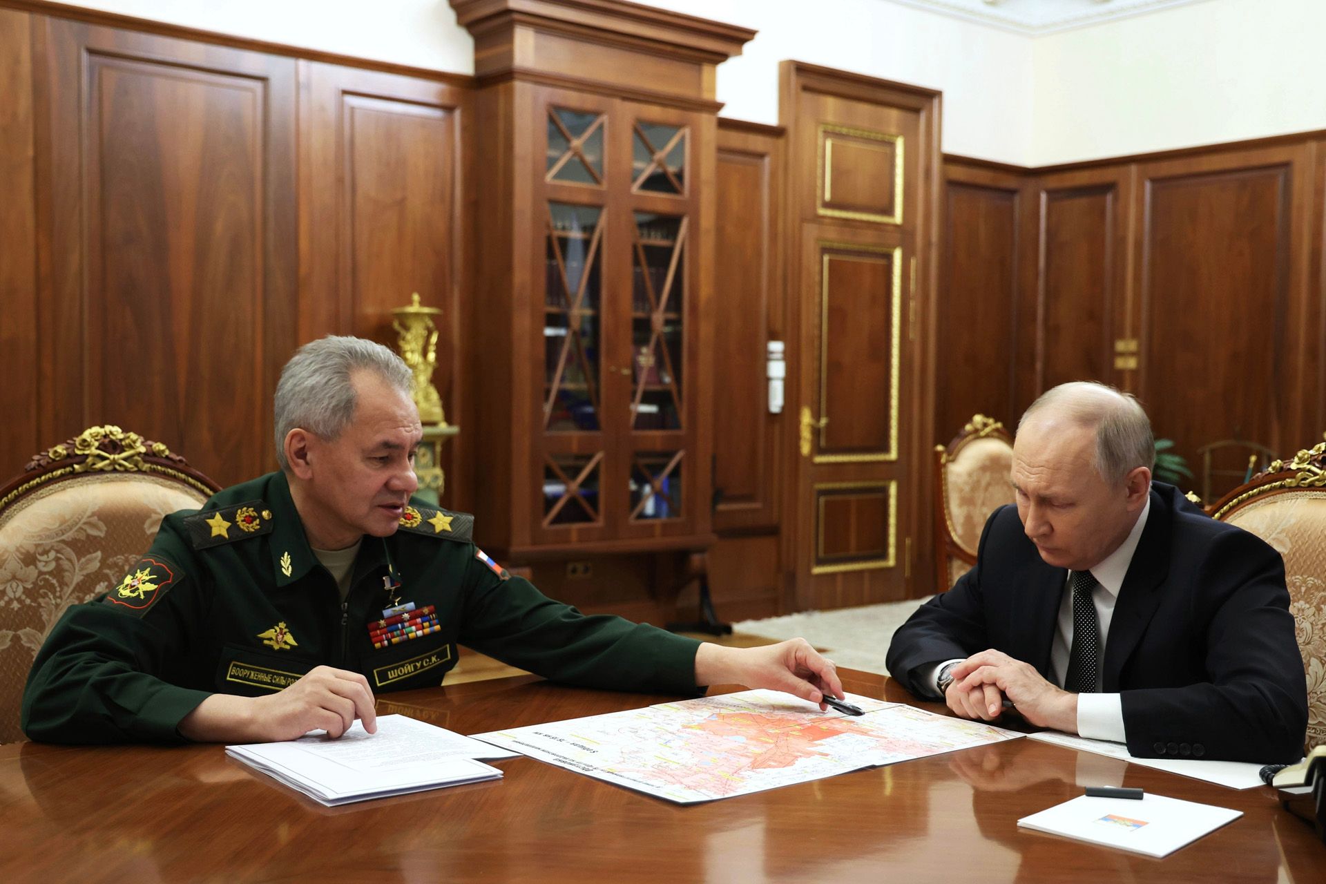 Александр Казаков / Спутник / AP / Scanpix / LETA Владимир Путин слушает отчет министра обороны Сергея Шойгу. Глава Минобороны доложил, что российская армия взяла под контроль село Крынки Херсонской области, расположенное на подконтрольном ВСУ левом берегу Днепра. Украинская сторона не комментировала захват Крынок