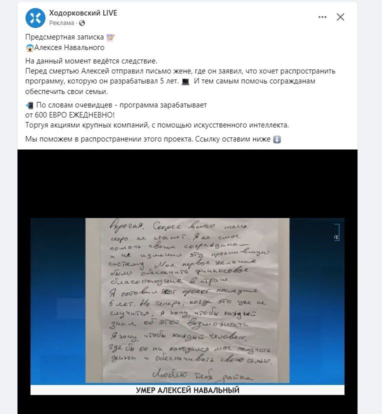 Рекламные посты размещены от имени фейковых групп, названия которых схожи с сообществами сторонников оппозиции. В них размещена фотография письма, якобы написанного Алексеем Навальным его жене Юлии. Как утверждается в мошеннической рекламе, Навальный «перед смертью отправил письмо жене, где заявил, что хочет распространить программу, которую он разрабатывал пять лет, — и тем самым помочь согражданам обеспечить свои семьи».
