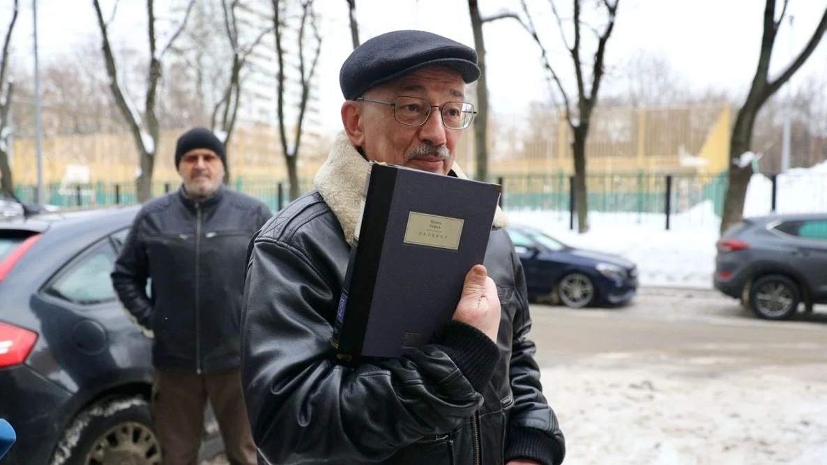 Олег Орлов с книжкой Франца Кафки «Процесс» у здания суда. Фото: Александра Астахова