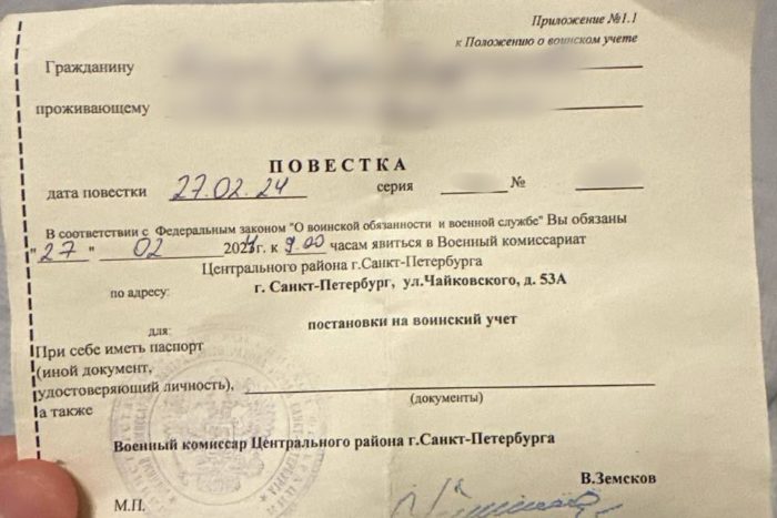 Контекст. Вечером 20 февраля стало известно, что силовики в Петербурге начали вручать повестки в военкомат мужчинам, которые выходят из-под ареста в изоляторе временного содержания. Они попали туда после того, как возлагали цветы в память об Алексее Навальном.