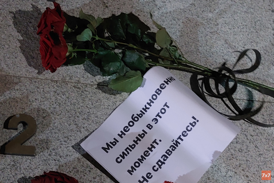 Цветов было все больше. Одни краснодарцы задерживались рядом с мемориалом, другие с заплаканными глазами быстро клали четное число роз или гвоздик и шли дальше, не останавливаясь. Через час на плите появился листок с фразой: «Мы необыкновенно сильны в этот момент. Не сдавайтесь!» из документального фильма «Навальный», где Алексей озвучил послание на случай, если его убьют.