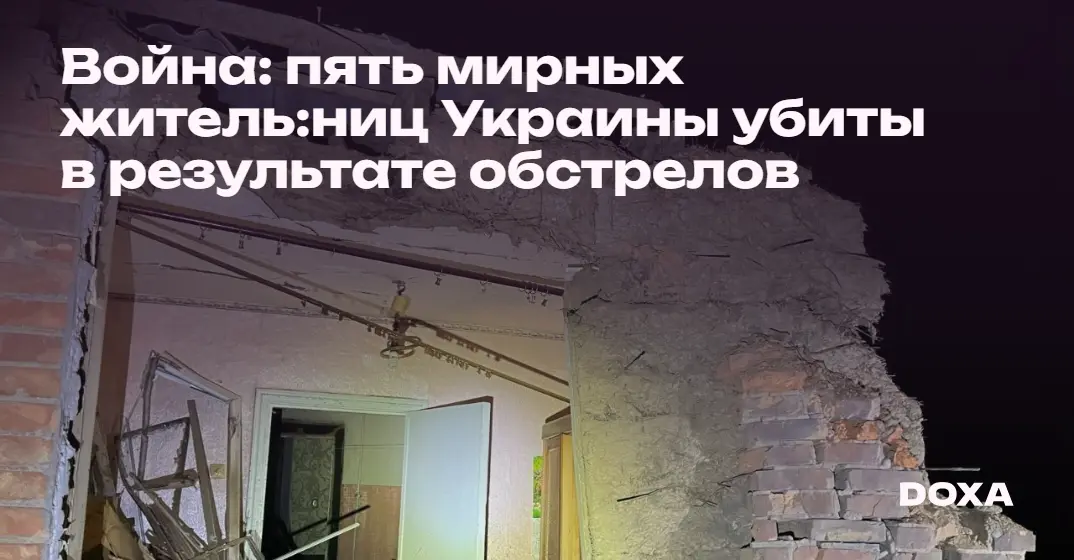 По меньшей мере пять мирных житель:ниц Украины были убиты в результате обстрелов российской армии. Еще 29 человек получили ранения. Россия обстреляла Донецкую, Херсонскую, Харьковскую, Николаевскую, Сумскую, Днепропетровскую и Одесскую области Украины, сообщили сегодня администрации этих регионов.