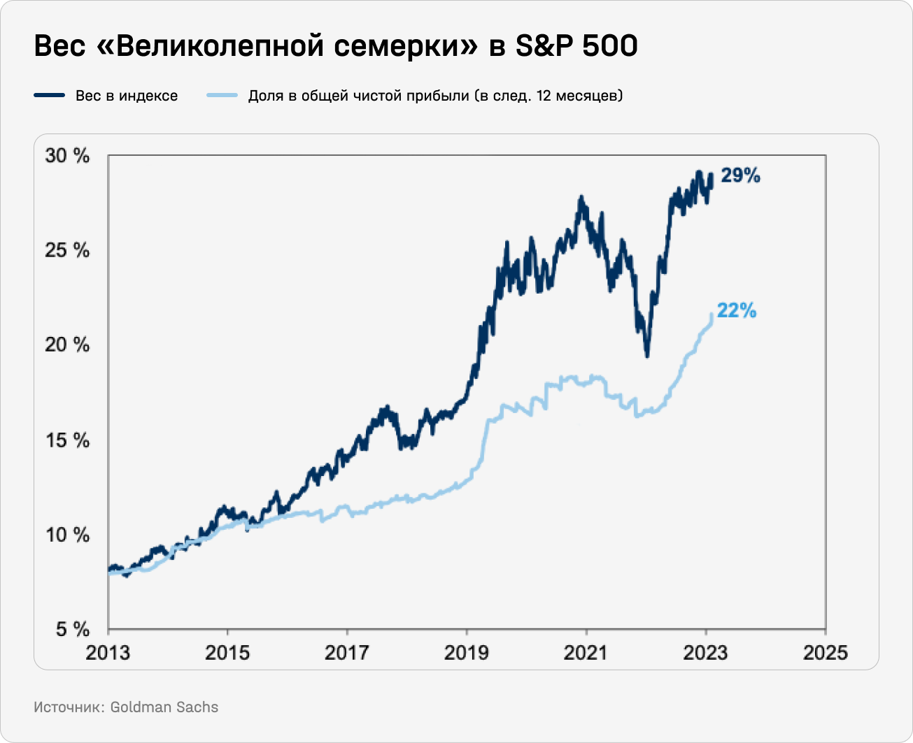- по данным GS на начало февраля, доля «семерки» в капитализации S&P 500 достигла 29%. При этом на эти компании приходится только 22% ожидаемой в ближайшие 12 месяцев чистой прибыли.