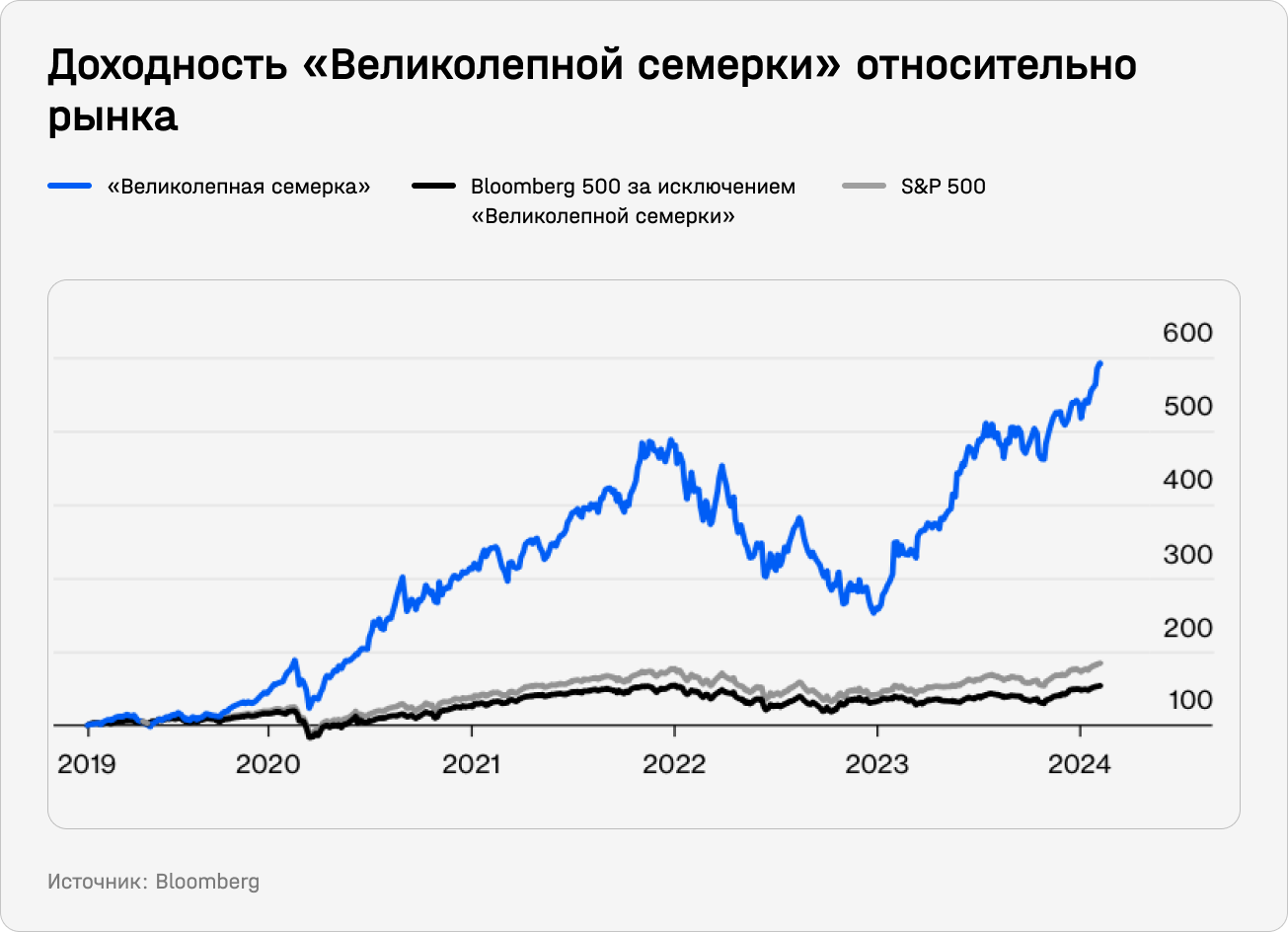 В 2023 году именно «семерка» тащила вверх фондовые индексы: их акции в среднем выросли на 76% против 14% для остальных 493 акций S&P 500. В 2024-м опережающая динамика «семерки» сохраняется. Этому не помешало даже то, что акции Tesla — единственной компании из «семерки», не оправдавшей ожидания в ходе текущего сезона отчетности, — с начала года снизились более чем на 20%. И пока оптимизм инвесторов насчет бигтехов не уменьшается: февральский опрос управляющих, проведенный Bank of America, показал, что лонг технологических компаний остается самым популярным трейдом.