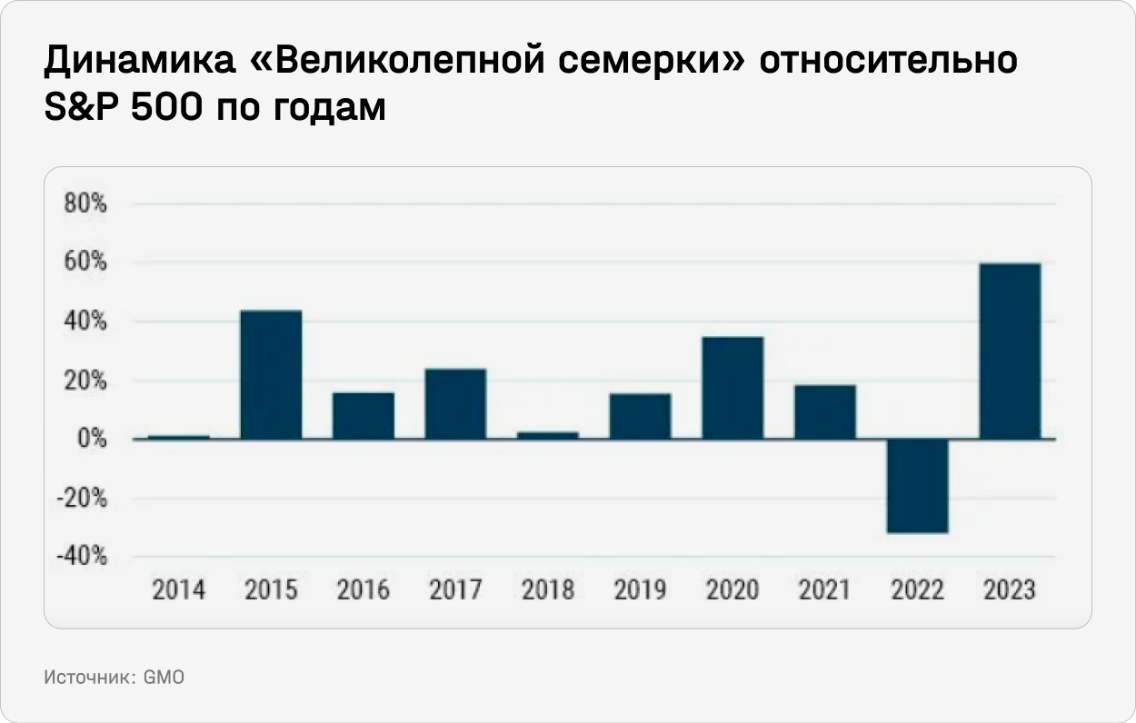Будущая динамика акций «Великолепной семерки» — главный вопрос, который сейчас волнует инвесторов, говорится в недавнем отчете Goldman Sachs (GS). Опережающая доходность самых дорогих компаний и их высокие оценки (30x fwd. P/E против 18x у рынка в целом) ставят под сомнение устойчивость ралли.