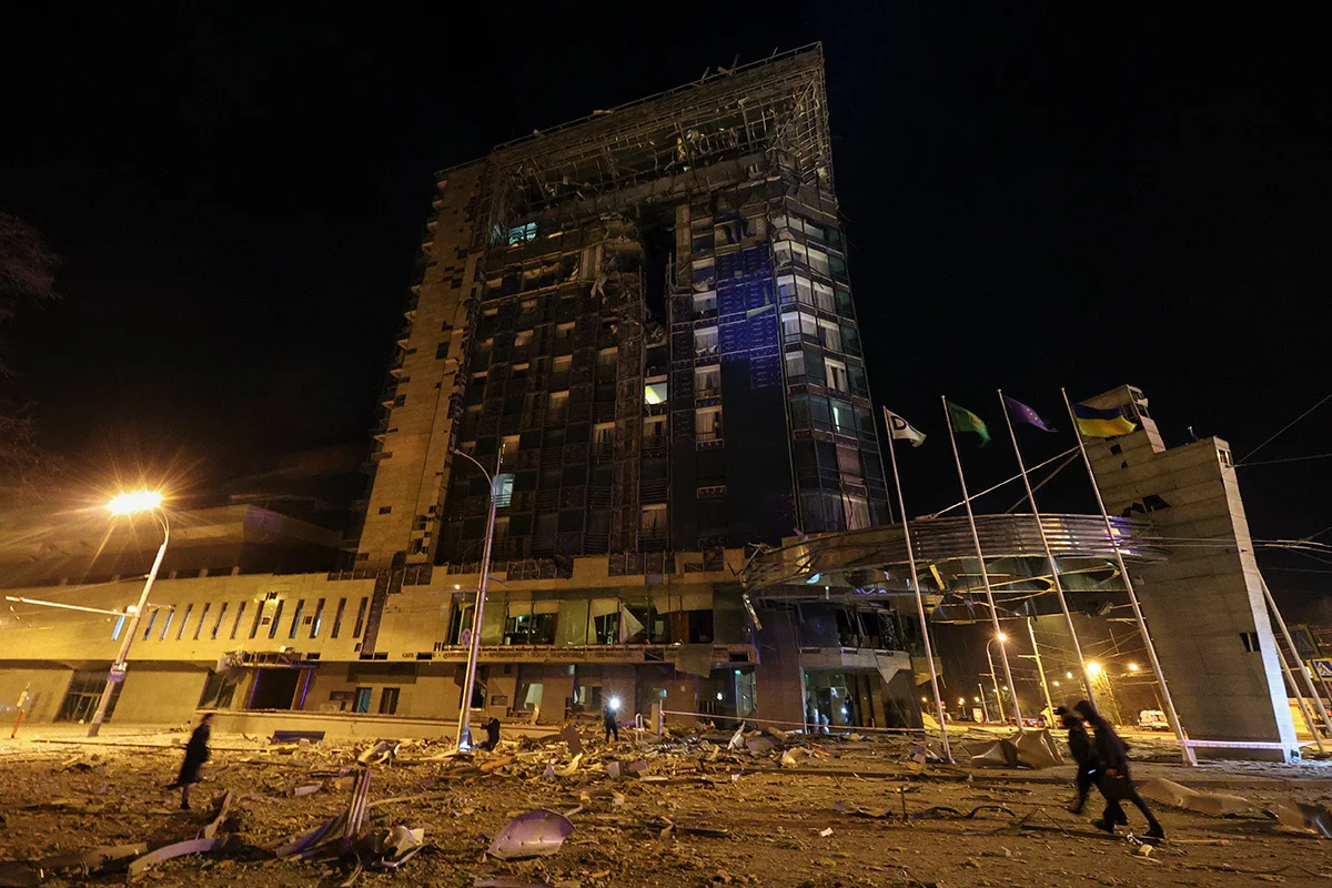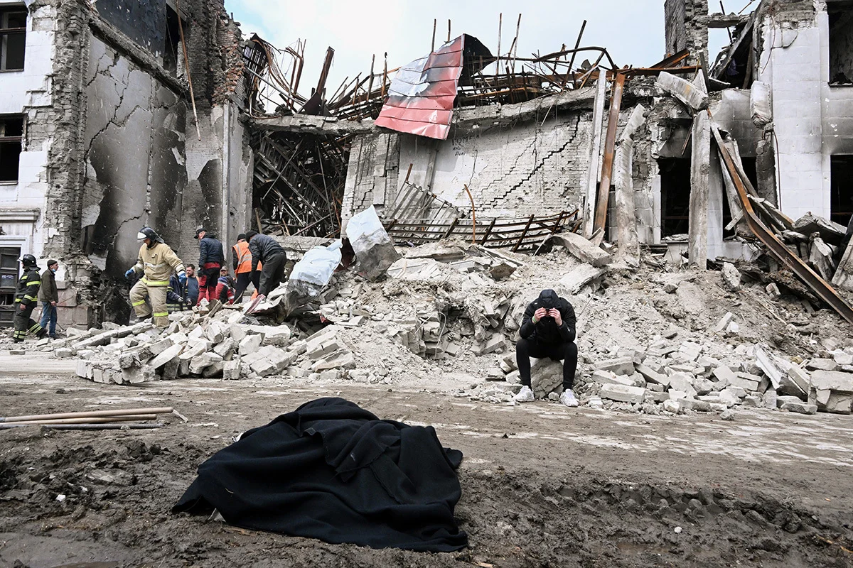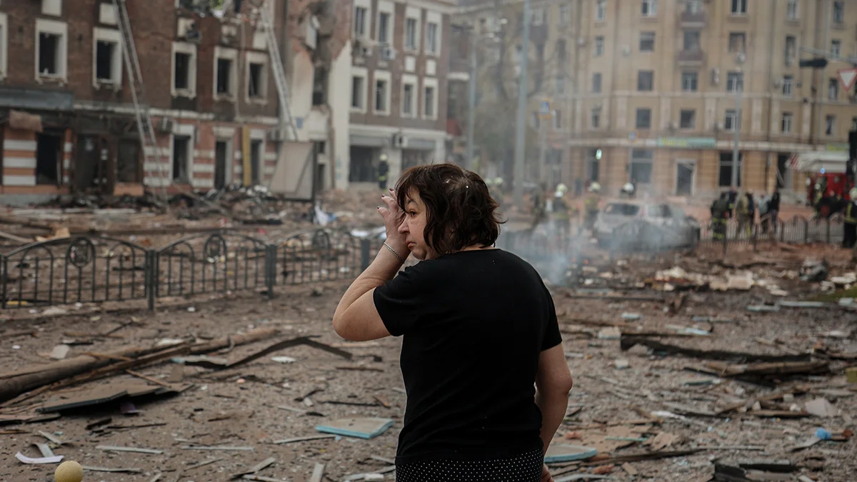 Женщина на фоне последствий ракетного удара по Харькову, Украина, 6 октября 2023 года. Фото: Яков Ляшенко / EPA-EFE