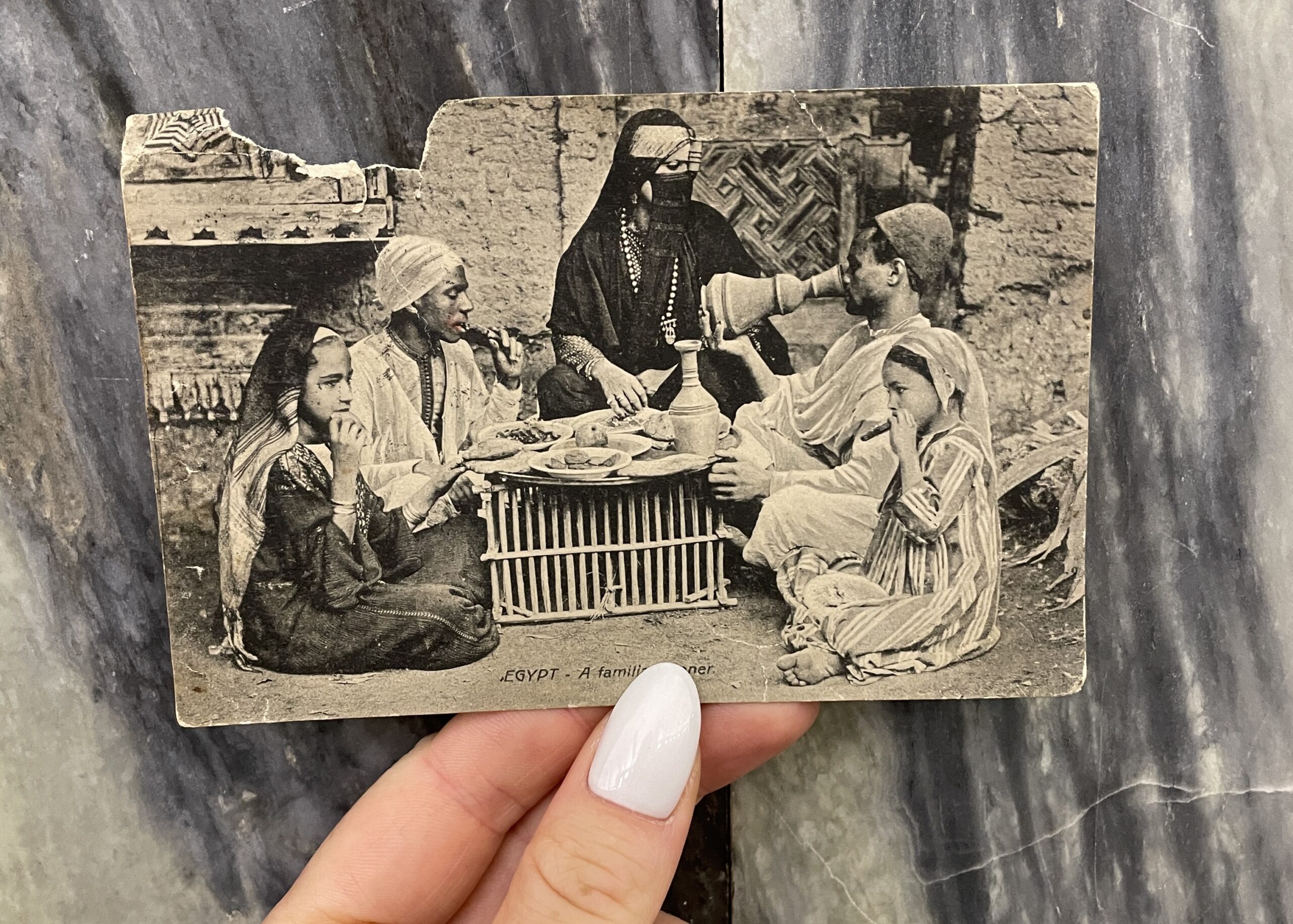 Внимание специалистки по восточной культуре привлекла открытка с изображением египетской семьи, девушка сразу же решила ее купить и отложила в сторону.