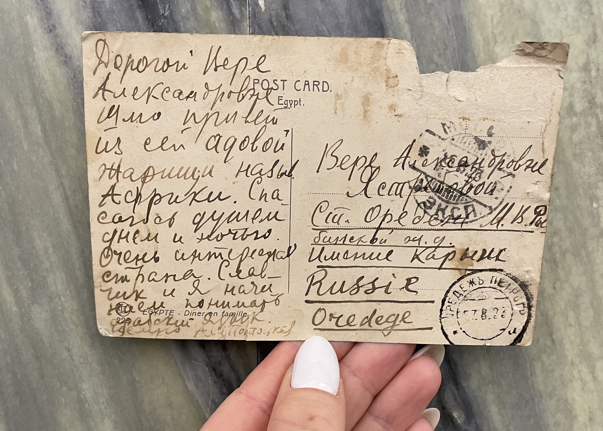 Искусствовед Полина Любимова обнаружила на Удельном рынке почтовую открытку, которую отправила в 1923 году из Египта художница Александра Щекатихина-Потоцкая. Артефакт стоил всего 50 рублей.