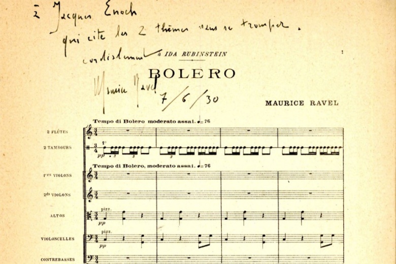 Фрагмент партитуры "Болеро" Морис Равеля с автографом автора