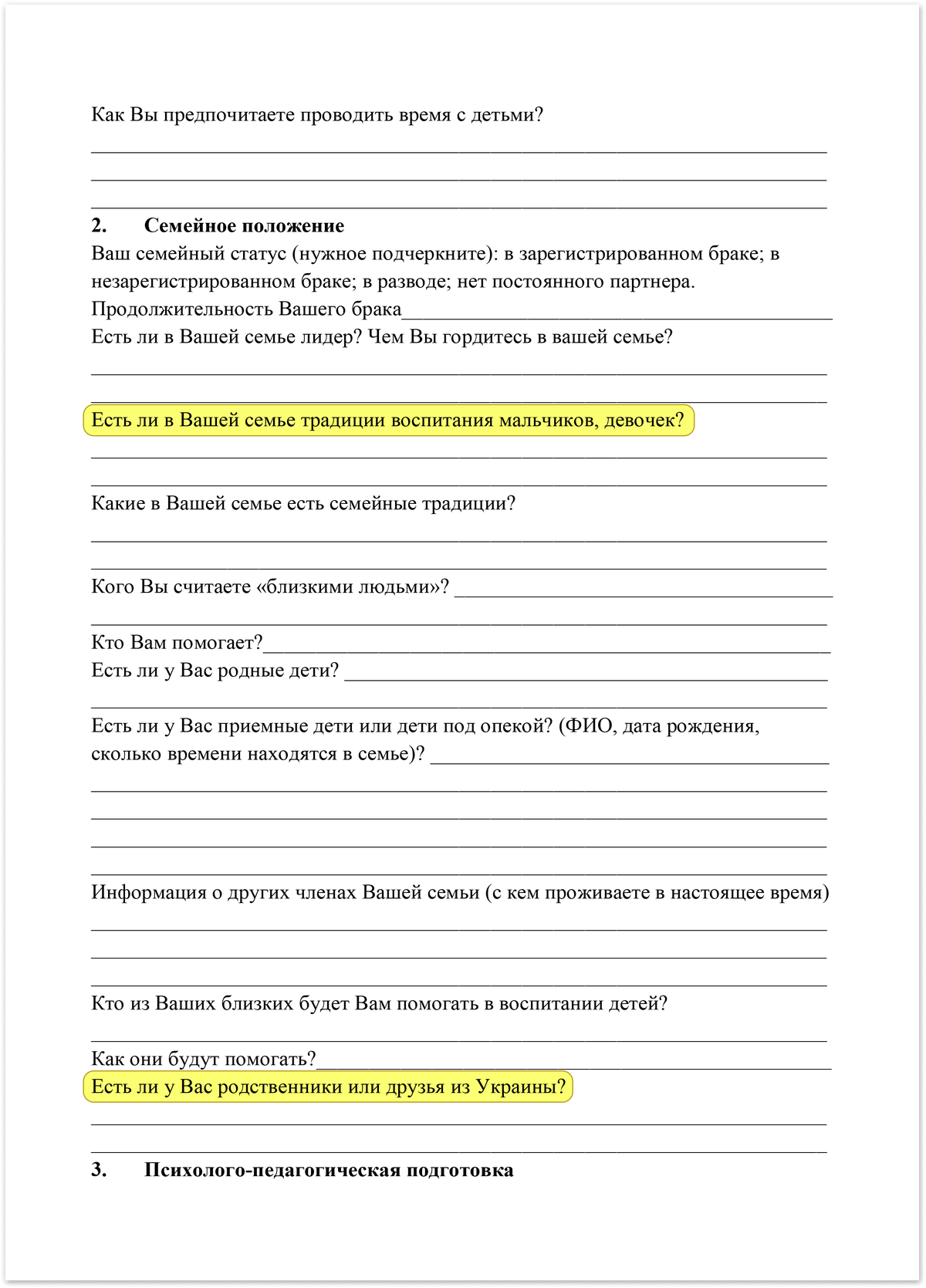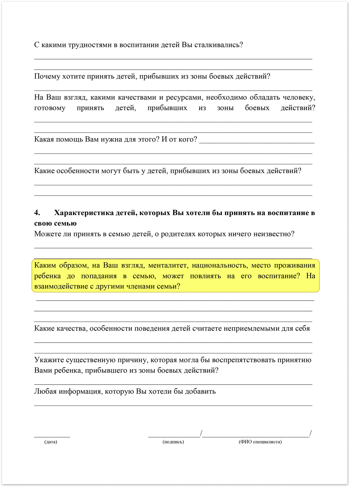 Как следует из документа, перед обучением потенциальные приемные родители должны пройти собеседование, на котором будут выяснять их «мотивы, ожидания, понимание правовых и иных последствий приема в семью детей, прибывших из зон боевых действий». В частности, родителей спрашивают, есть ли у них родственники или друзья из Украины, как менталитет и национальность ребенка влияют на его воспитание, а также о том, есть ли в семье традиции воспитания мальчиков и девочек.