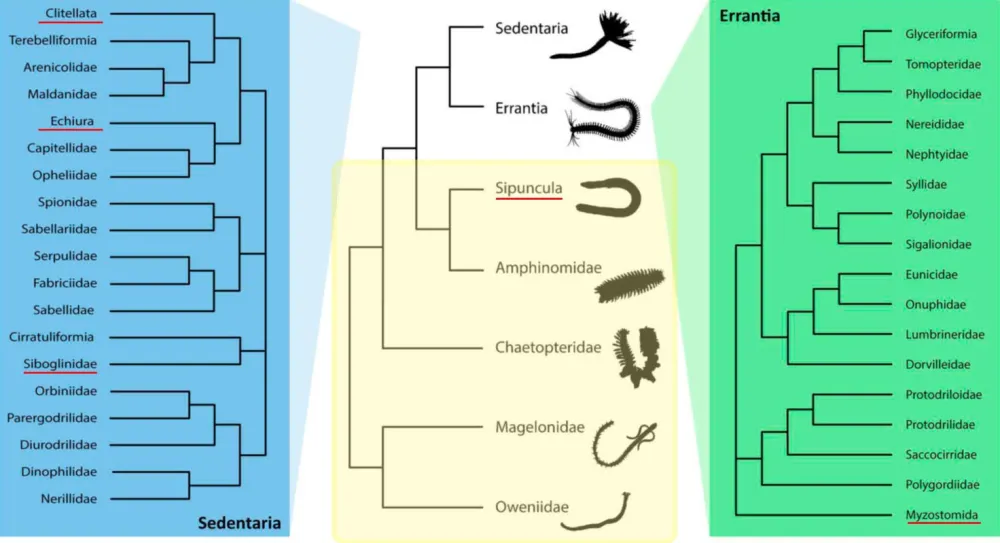 — Для Annelida (кольчатых червей) за последние 20–25 лет молекулярные методы полностью перестроили общую систему. Нас когда-то учили, что кольчатые черви делятся на многощетинковых (полихет) и поясковых (клителлят), а они в свою очередь на малощетинковых (олигохет) и пиявок. А полихеты делились на эррантных (бродячих) и седентарных (сидячих). Но уже во второй половине XX века считали, что это так себе группировки, не очень хорошие, скорее экологические, чем таксономические. Кроме того, были группы ранга классов и типов неясного таксономического положения, более или менее родственные кольчатым червям, такие как сипункулиды, эхиуриды, сибоглиниды (это погонофоры, вестиментиферы, оседакс), мизостомиды. Теперь же стало понятно, что все эти группы входят в состав аннелид. Более того, таксоны эррантных и седентарных полихет снова вернули в систему, но уже с новым смыслом. И сейчас сложилась более-менее общепринятая система, что у аннелид есть группы базальной радиации, и есть эррантные и седентарные — группы, к которым принадлежит большинство видов. Интересно, что малощетинковые черви и пиявки вошли в состав группы седентарных. Получилось, что таксон Polychaeta (многощетинковые черви) потерял свой смысл, так как стал тождественен Annelida. И хотя это слово по старой традиции используется и всем понятно, в строгой научной терминологии мы не должны его употреблять.