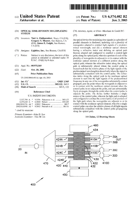 Примерно через неделю пришел ответ из Intel, который превзошел наши ожидания. Intel согласен был инвестировать пять миллионов и даже предоставить нам возможность использования оборудования внутри их лаборатории. Единственным условием было требование найти спонсора-лидера (у спонсоров есть такая шкала). Среди нашего всеобщего ликования мы не сразу оценили подводные камни в ответе Intel. Приглядевшись, мы поняли, что Intel хочет подмять нас вместе с нашей инновационной идеей, т. е. фактически стать обладателем интеллектуальной собственности на случай, если идея на самом деле сработает. В этот момент мы поняли, что единственной нашей защитой может быть серия патентов с описанием как принципов построения системы OTDM, так и ее нелинейно-оптических элементов.