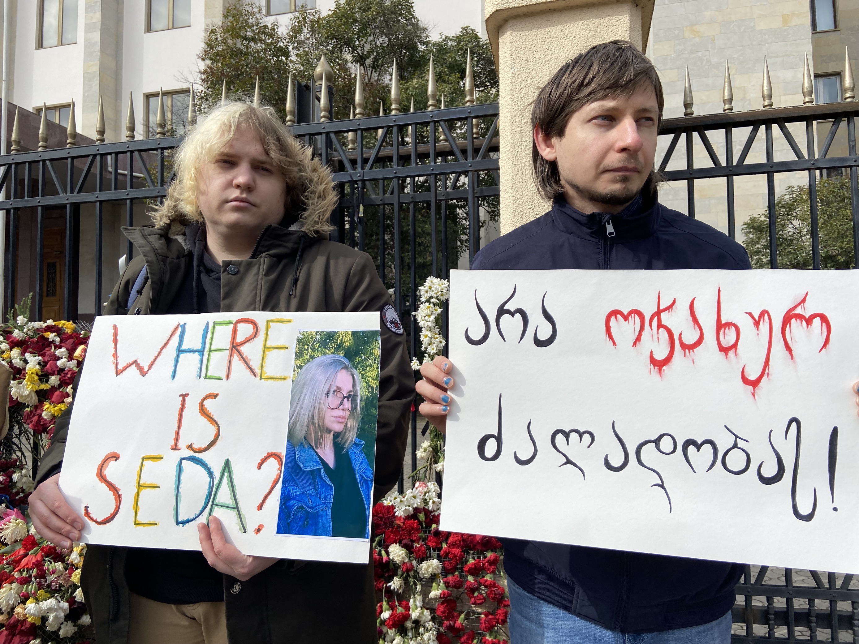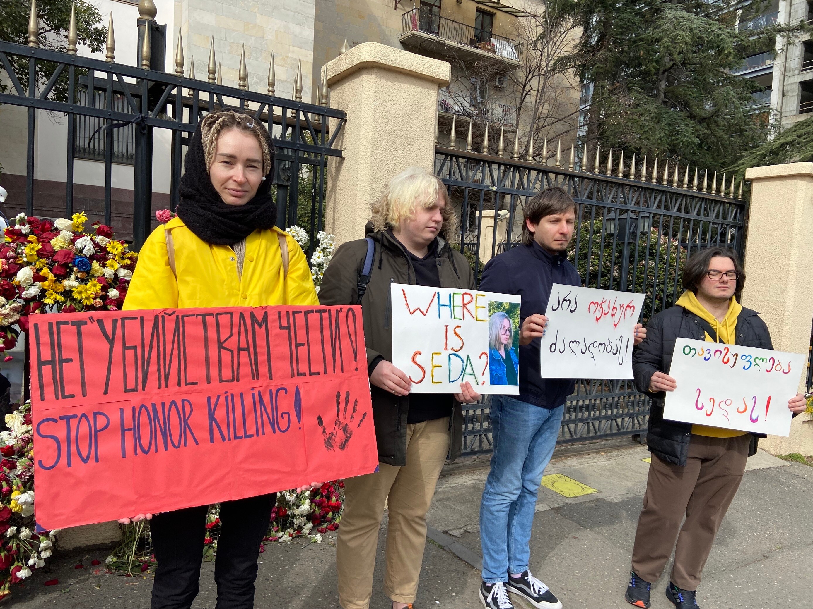 Акция в Тбилиси прошла у секции интересов России при посольстве Швейцарии в Грузии. Одной из соорганизаторок акции стала волонтерка группы "Марем", помогающей пострадавшим от домашнего насилия на Северном Кавказе, Екатерина Нерозникова. По ее словам, главный вопрос акции – где сейчас находится Седа Сулейманова. Активисты и активистки держали плакаты со словами "Свободу Седе" и "Нет убийствам чести".