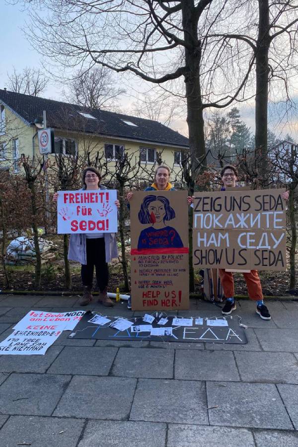 Акция в поддержку Седы в Бонне, Германия Фото: участники акции В конце февраля Лена стала соорганизаторкой акций в честь Седы в разных городах мира. Их участники вышли с плакатами к дипломатическим представительствам России в Грузии, Германии, Италии, Польше, Аргентине, Мексике. Они требовали предоставить информацию о местонахождении чеченки и освободить ее. Анонсы новых акций будут появляться в соцсетях кризисной группы СК SOS.