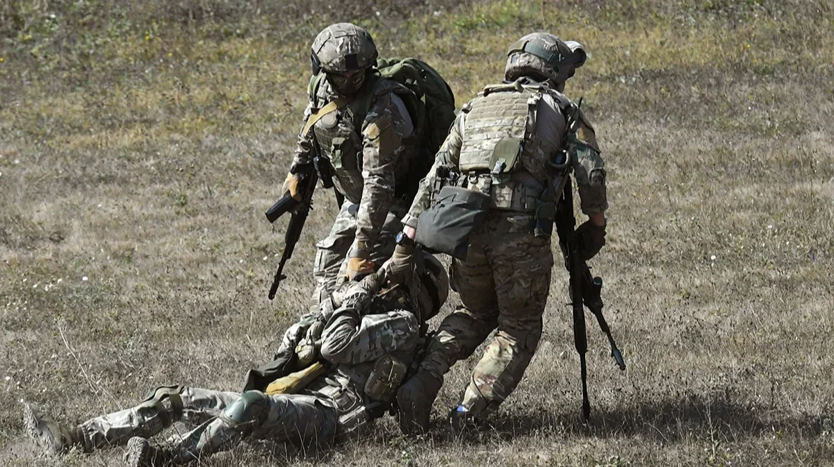 A wounded Russian soldier is carried during a military drill in Crimea, 13 September 2023. Source: Viktor Korotaev / Kommersant / Sipa USA / Vida Press