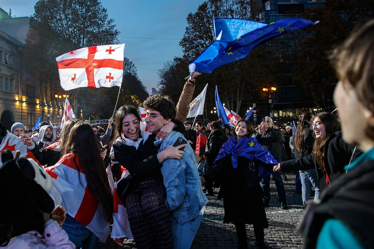 Люди празднуют на митинге после предоставления Грузии статуса официального кандидата на вступление в Европейский союз в центре Тбилиси, Грузия, 15 декабря 2023 года. Фото: David Mdzinarishvili / EPA-EFE