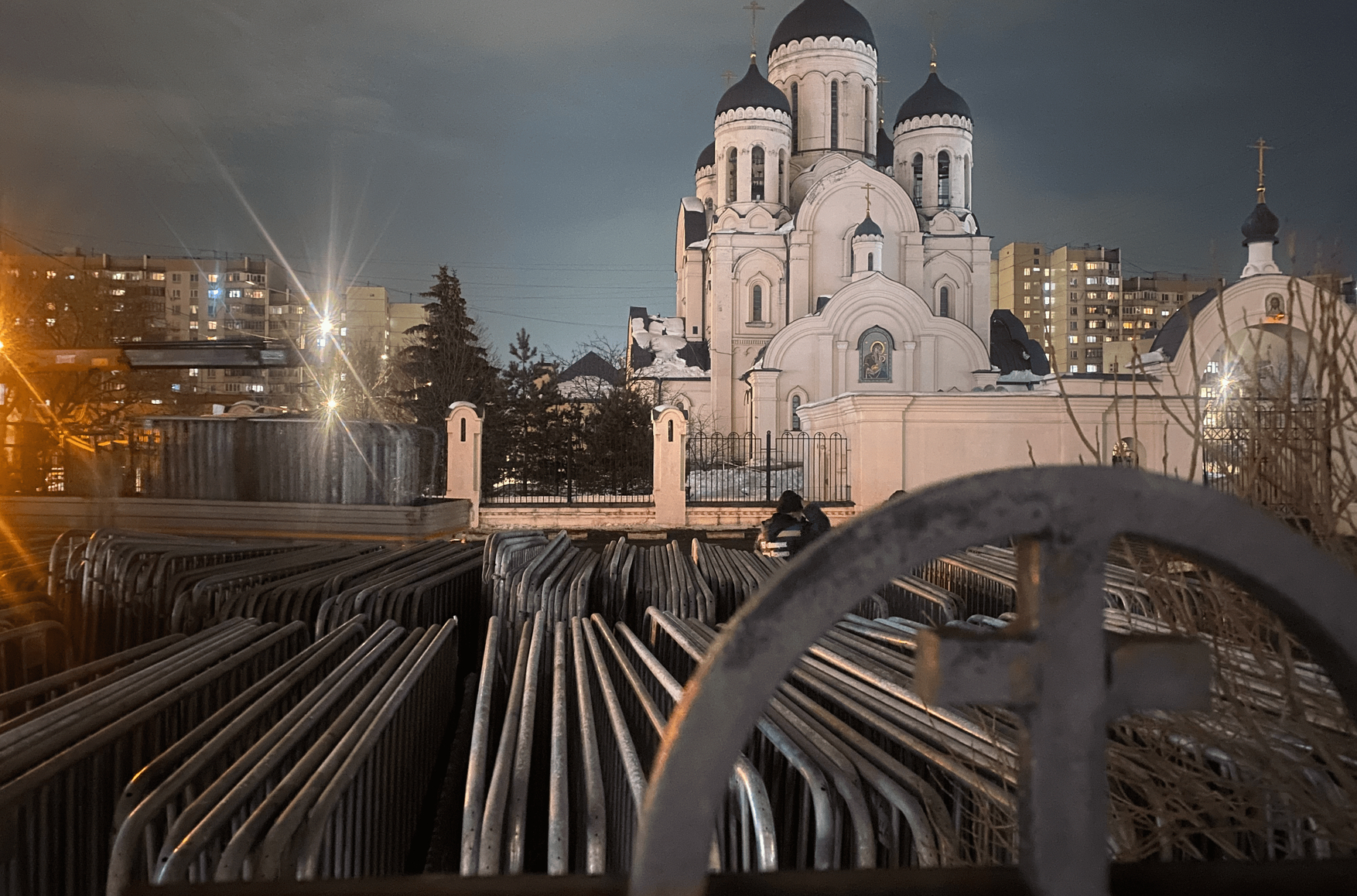 Заграждений очень много, «будто со всего города свозили», говорит корреспондент. Складывают их прямо на территории церкви. Заграждения выставили по всем окрестностям вокруг метро. В том числе рядом с домом Навального — церковь находится примерно в 200 метрах оттуда.
