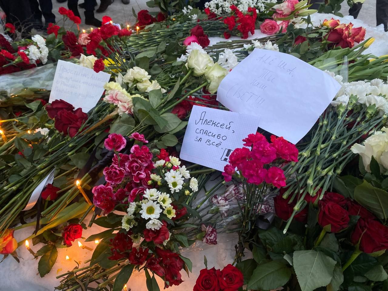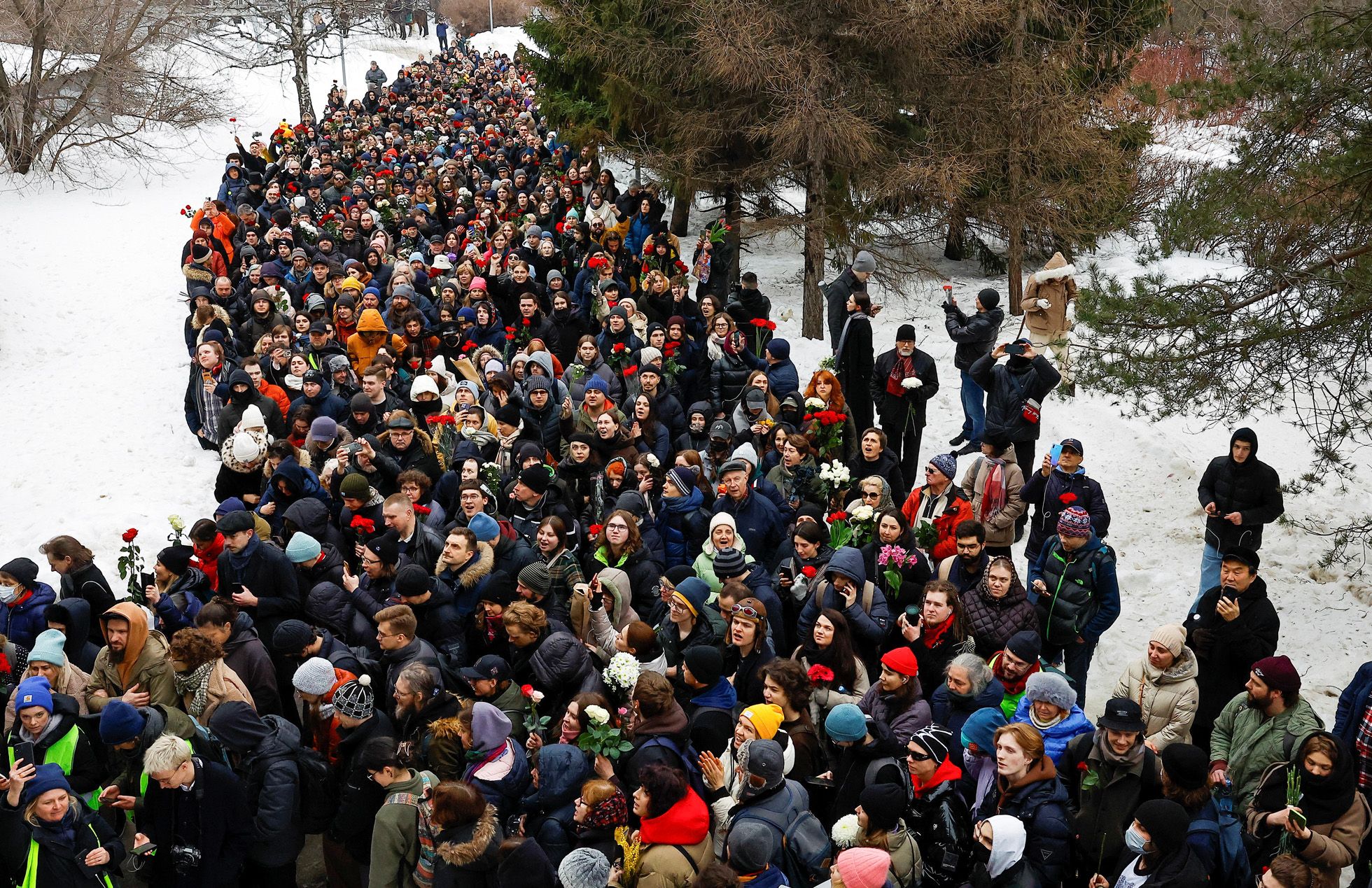 Сегодня, 1 марта 2024 года, в Москве простились с Алексеем Навальным. Несмотря на то, что в России фактически запрещены любые уличные акции, у церкви «Утоли моя печали» в Марьино, где проходило отпевание, и Борисовского кладбища собрались десятки тысяч людей, в том числе дипломаты европейских стран и США, а также российские политики Евгений Ройзман, Борис Надеждин и Екатерина Дунцова. Полиция заранее оцепила территорию церкви металлическими ограждениями, интернет в окрестностях храма работал с перебоями. Борисовское кладбище, где после отпевания похоронят Навального, в пятницу закрыли для посещений — но и там были толпы. «Медуза» собрала главные фотографии этого дня — исторического и трагического для России.