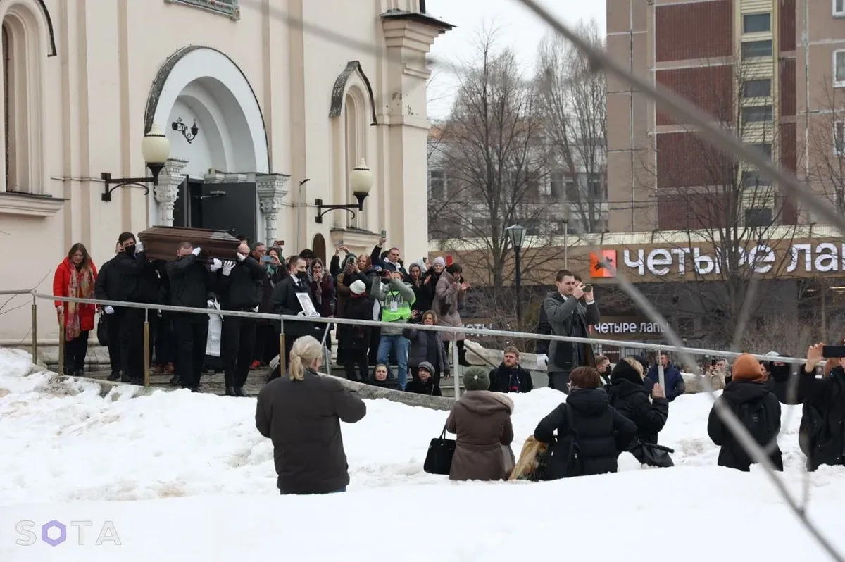 14:00. Гроб с телом Алексея Навального заносят в храм. Люди встретили катафалк аплодисментами. Скандируют: «На-валь-ный»!