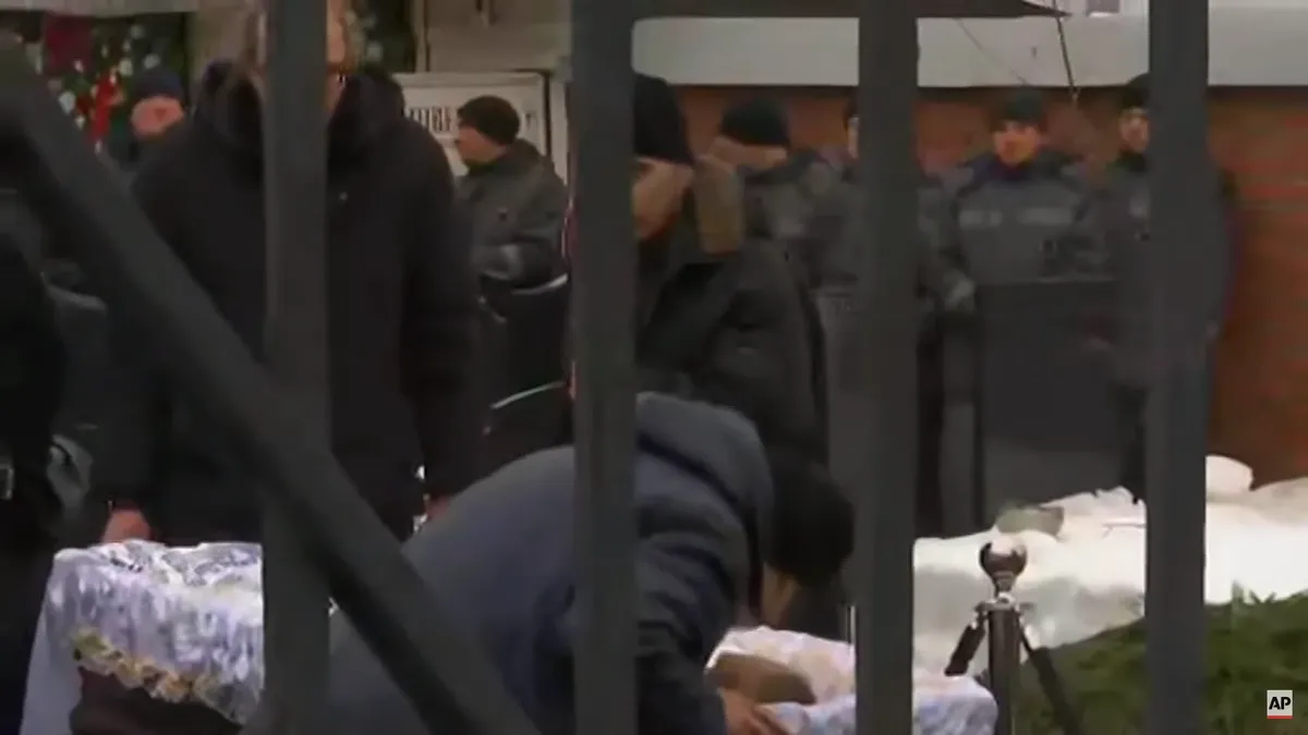 16:00. Гроб с телом Алексея Навального привезли на кладбище, у могилы — родители Алексея Навального. Началось прощание. На скриншоте — кадр трансляции Associated Press.