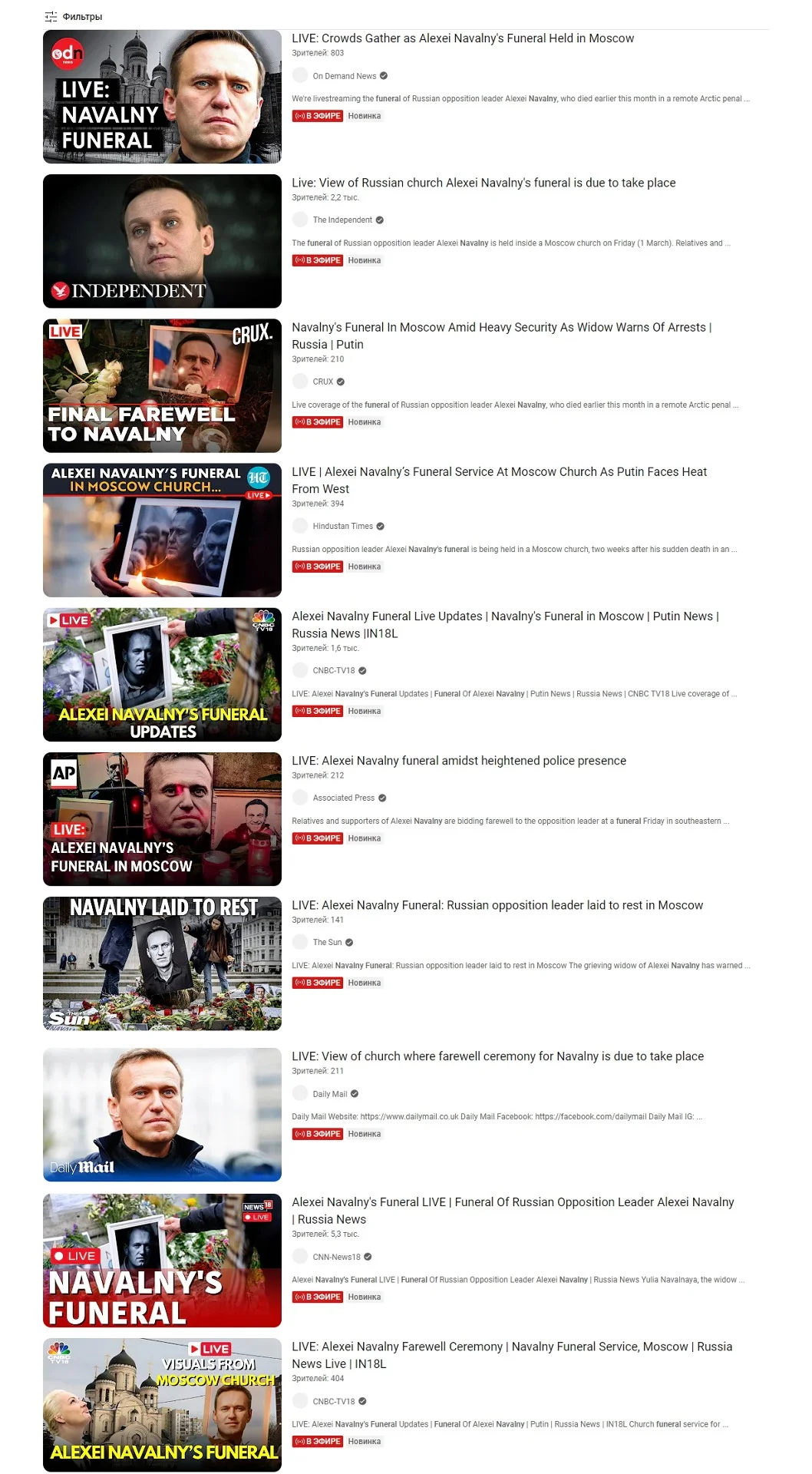 12:30. Онлайн трансляции прощания с Алексеем Навальным прямо сейчас ведут мировые СМИ в Youtube: