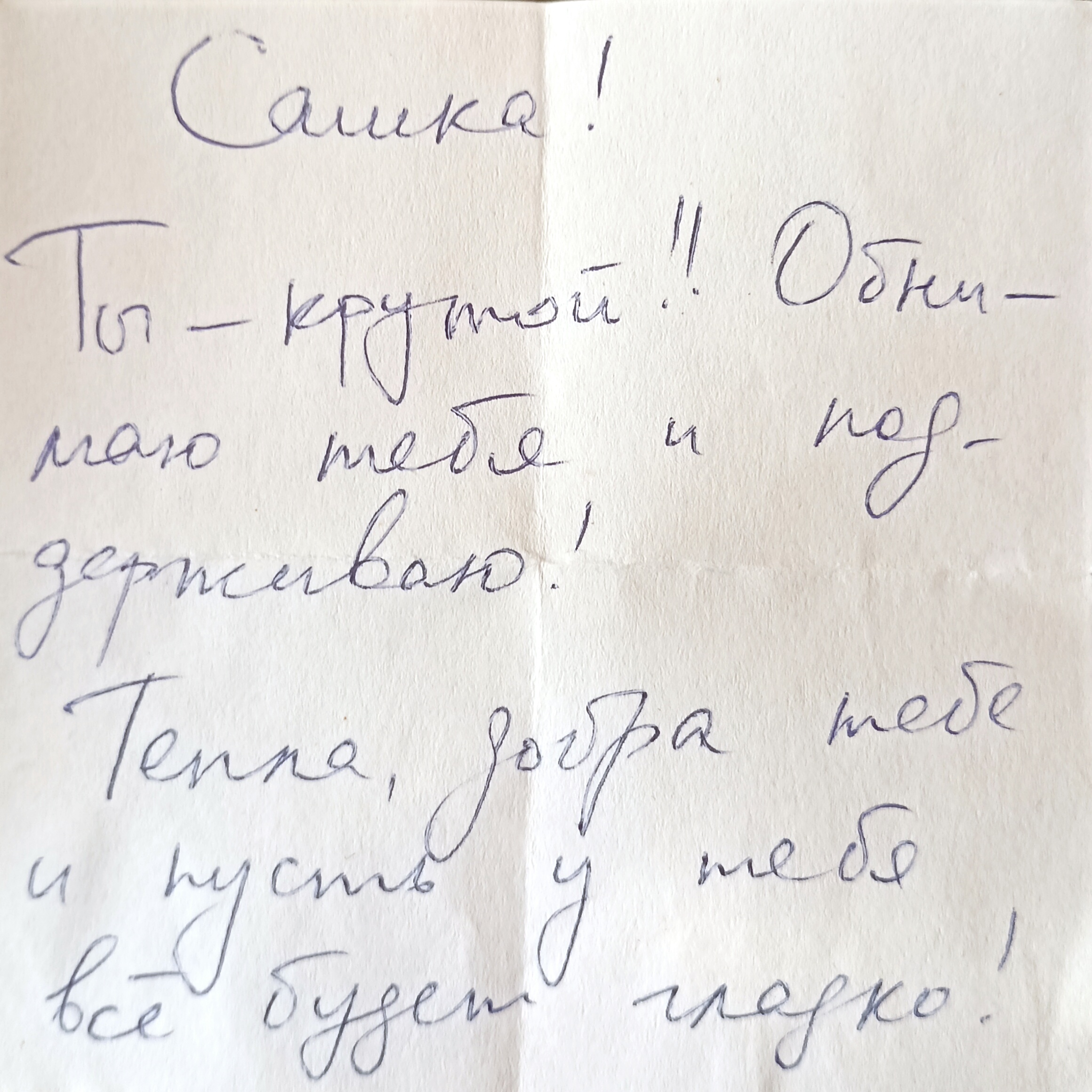Записка, которую передали в спецприемник Александру Мишуку Фото: из личного архива Александра Мишука Организаторы проекта Letters of Freedom в Ереване Иван Любимов и Александр Мишук до эмиграции сами прошли через спецприемник. «Я стоял в пикете 25 февраля, меня забрали. Пока я сидел на своих сутках, получал маленькие записки и письма, — говорит Александр. — Это очень поддерживает, помогает в этих условиях не сойти с ума, помнить, что где-то там есть обычная жизнь, люди тебя ждут. Эти записки у меня до сих пор с собой».