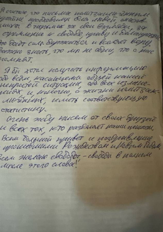 Письмо Евгения Бестужева из СИЗО Фото: «ОВД-Инфо» Михаил Жариков, которого приговорили к шести годам колонии за антивоенные посты, рассказал, что письма нужны политзаключенным, чтобы быстрее адаптироваться к тюремным условиям. «У них нет опыта, а значит, нет понимания, чего ожидать. Как следствие, [у них] шок на первом этапе. Человек сваливается во внутренний вакуум и замыкается», — объясняет Жариков.