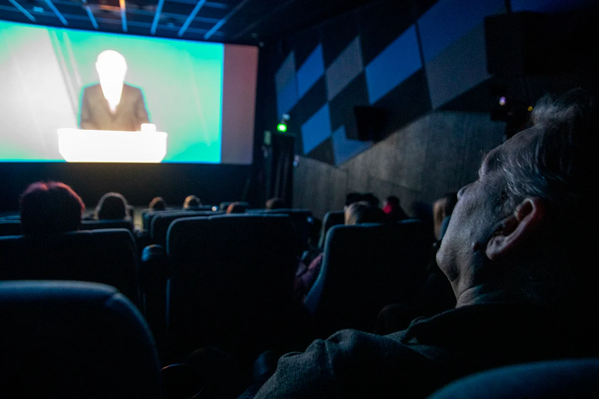 Кадр из обращения федеральному собранию, транслируемого на экране кинотеатра. Фото: Дмитрий Цыганов, специально для «Новой газеты Европа»