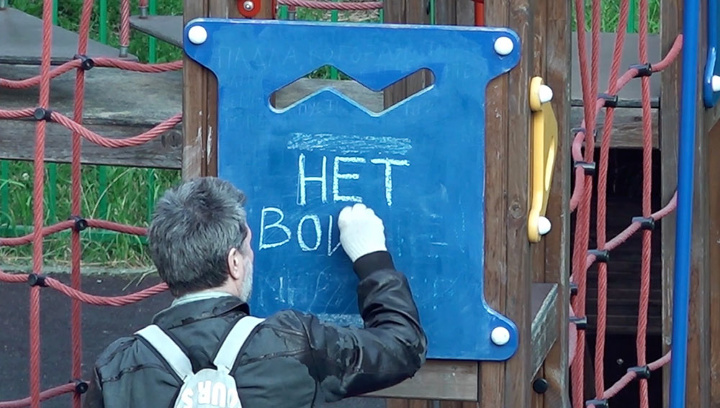 Или картина "Да Нет Войне", где молодой человек снимает из окна своей квартиры: каждую ночь кто-то на детской площадке мелком пишет "Нет войне!". Каждое утро приходит из ДЭЗа некий таджик и стирает эту надпись. А потом он спускается к этому мужику и немножко с ним говорит. И у того есть некая аргументация, что он человек подневольный, он ни за, ни против. Это слепок, который дает некое понимание, почему с Россией все так, а не иначе.