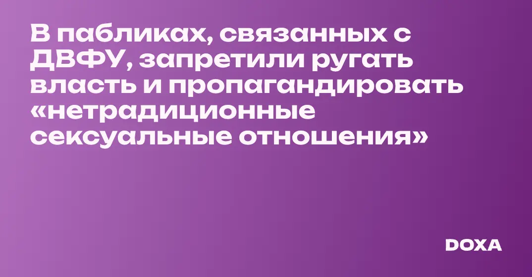 На страницах в социальных сетях, связанных с Дальневосточном федеральным университетом (ДВФУ), запретили ругать власть и пропагандировать «нетрадиционные сексуальные отношения», заметило владивостокское городское издание NEWS.VL. Кроме введения новых запретов, документ обязал администраторо:к, сообществ, связанных с ДВФУ, доносить о нарушениях новых правил ответственному за реализацию государственной молодежной политики в университете.
