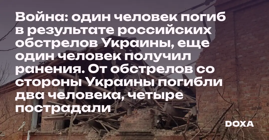 Война: один человек погиб в результате российских обстрелов Украины, еще один человек получил ранения. От обстрелов со стороны Украины погибли два человека, четыре пострадали