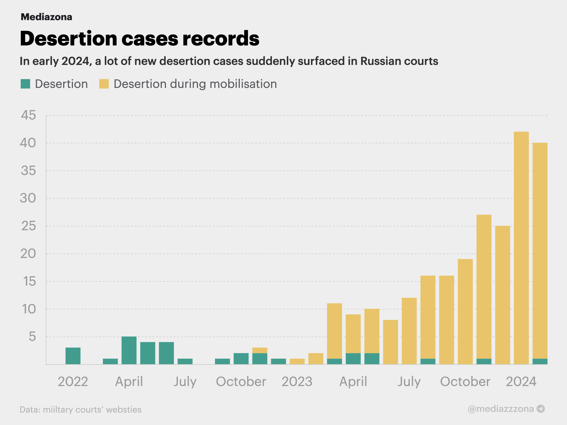 1,001 cases of the most popular “military crime,” AWOL, made it to courts in 2022 (Article 337 of the Russian Criminal Code). That’s one and a half times more than in pre-war 2021. But in 2023 there were 5,092 cases—and January 2024 set a new all-time record: 644 cases in just one month, and that’s with 10 days of holidays on New Year. Since the start of the year, 1,234 cases already made it to courts.