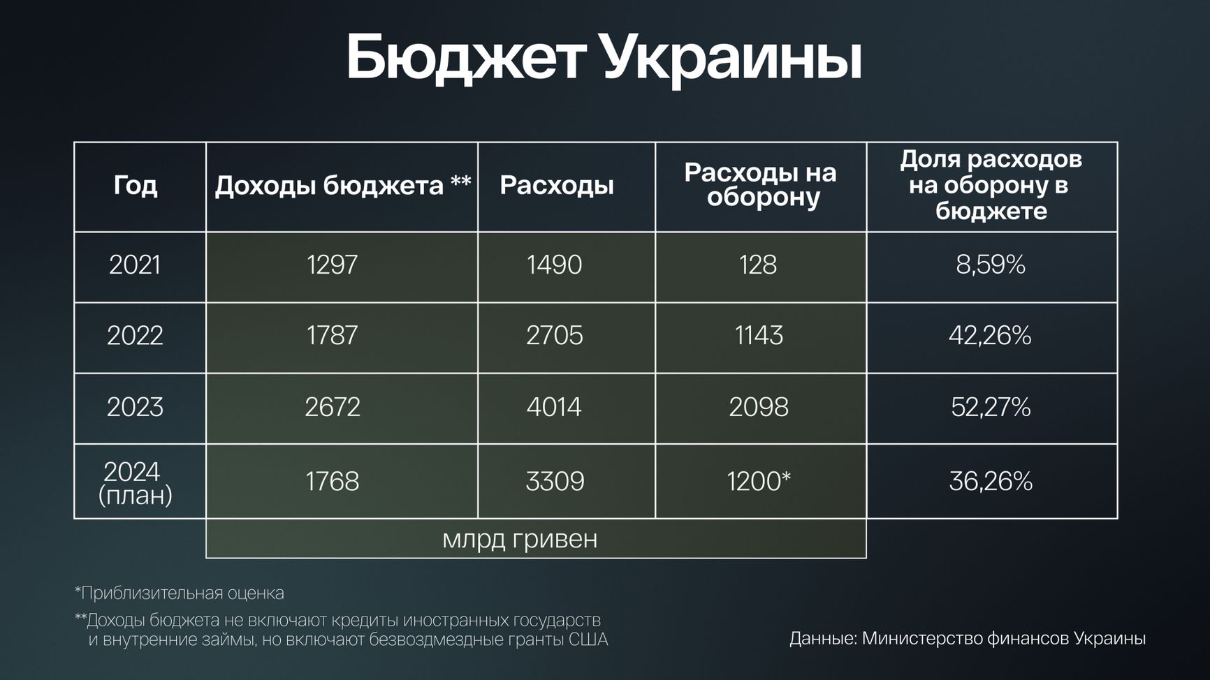 Importantly, Ukraine is not allowed to use this financial aid for military needs. As surprising as it may sound, two years into Russia’s full-scale invasion of Ukraine, the West formally refuses to finance the war. Therefore, Ukraine can cover its military expenses only with revenue from taxes, tariffs, duties, domestic loans (such as military bonds), state enterprise dividends, and so on.