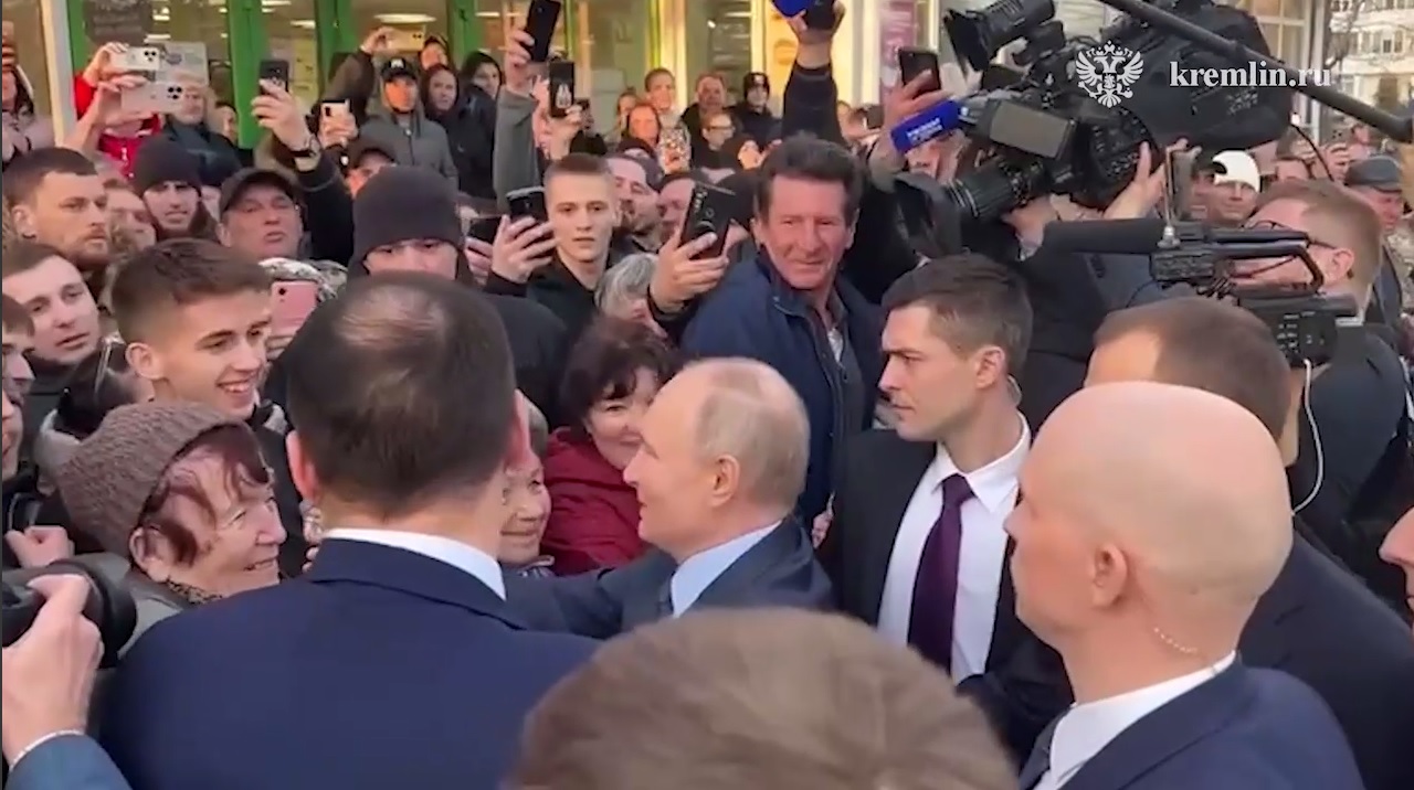 "Агентство" обратило внимание, что на видео ТАСС и пропагандистского телеканала "Звезда" видны перегородки, отделяющие президента, а в собравшейся толпе есть несколько мужчин в похожих шапках, не пытавшихся пообщаться с главой государства.