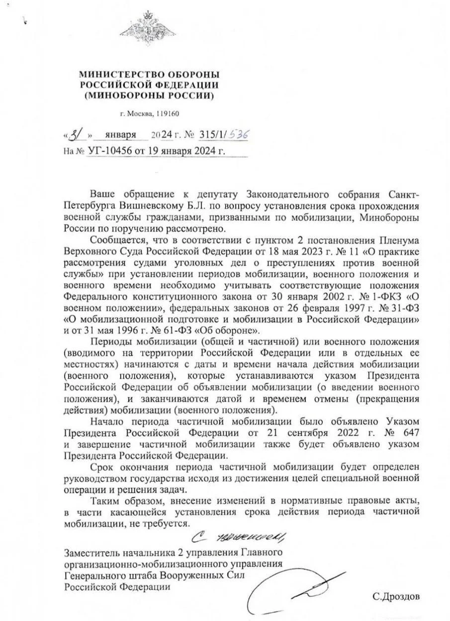 Ранее Минобороны сообщило в ответ на мое обращение, направленное по просьбе жен мобилизованных, что «начало периода частичной мобилизации было объявлено Указом Президента РФ от 21 сентября 2022 г. № 647, и завершение частичной мобилизации также будет объявлено указом Президента РФ». И что «срок окончания периода частичной мобилизации будет определен руководством государства, исходя из достижения целей специальной военной операции и решения задач».