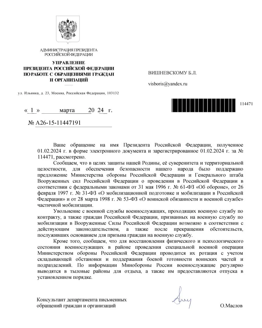 Администрация президента ответила мне на обращение к президенту России Владимиру Путину с призывом издать указ о завершении «частичной мобилизации», чтобы мобилизованные, призванные на основании указа № 647 от 21.09.22 г., могли вернуться домой.