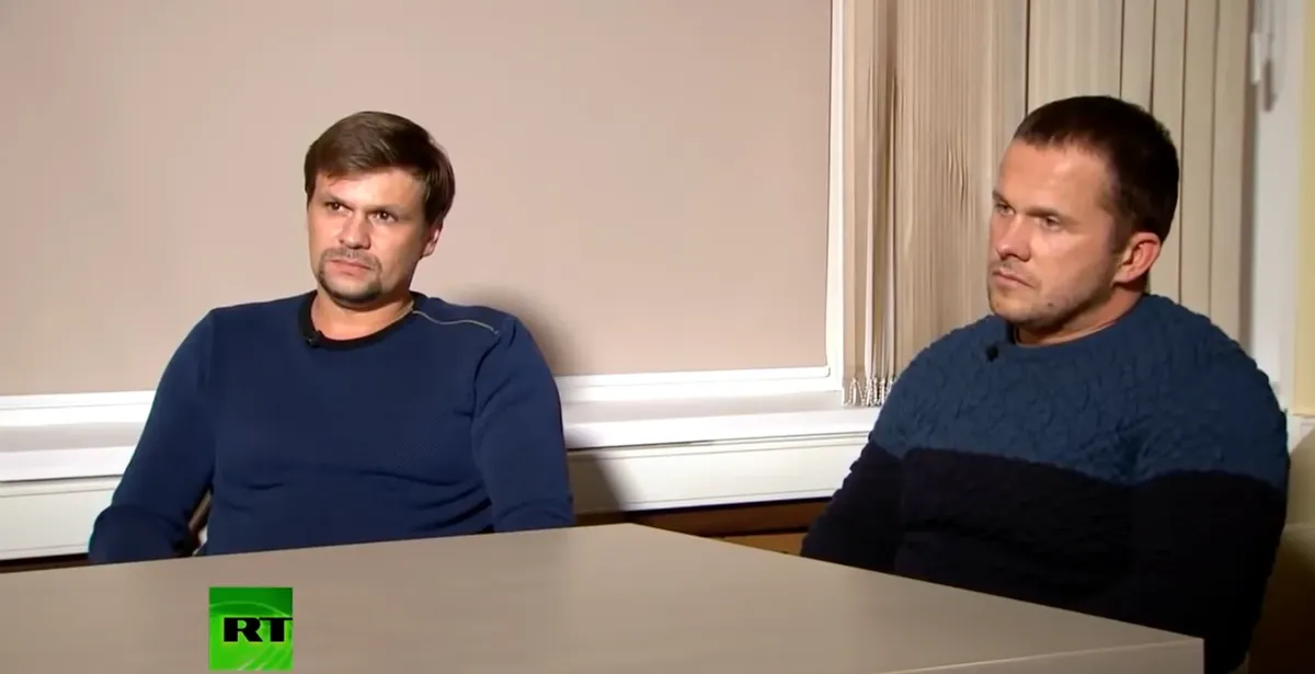 И уже на следующий день, 13 сентября, прокремлевская телекомпания RT выложила в ютуб интервью главного редактора телеканала Маргариты Симоньян с двумя мужчинами, чьи фотографии были опубликованы Великобританией как фото подозреваемых. Мужчины намекали, что они гей-пара (смело по нынешним российским меркам), сообщили, что Александр Петров и Руслан Боширов — это их реальные имена, заявили, что работают в фитнес-индустрии и что посещали Великобританию, и в частности Солсбери, в качестве туристов. Очень хотели посмотреть Солсберийский собор.