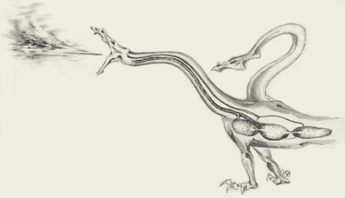 Наземное огнедыхание. «Одновременно с отрыжкой по пищеводу идёт мощный выдох через дыхательную систему. Из горла выходит фокусированный столб воспламеняемого газа, распыляющийся в облако». Рисунок А. Н. Квашенко из книги «Теоретическая драконистика»