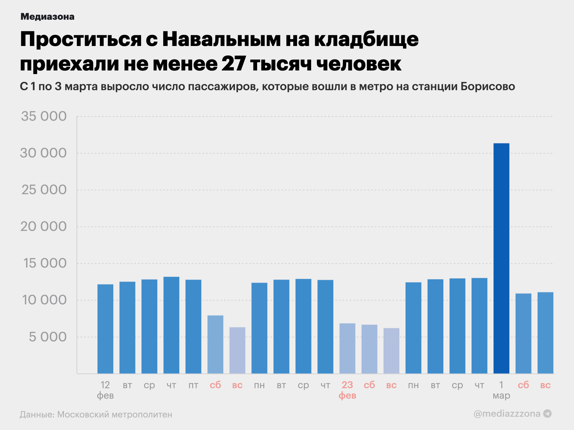 По данным метрополитена, 1 марта на станции «Марьино» в метро спустились примерно на 8,5 тысяч человек больше, чем в среднем в будний день. По словам корреспондентов «Медиазоны», которые снимали прощание с Навальным, часть людей ехали от «Марьино» до «Борисово», чтобы не идти пешком (то есть, частично попали в наш подсчет), а часть — ехали домой после отпевания. Те, кто пришел в церковь, но не поехал на кладбище, также не включены в 27 тысяч пассажиров метро.