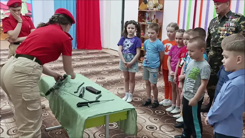 В Красноярском крае, в уярском детском садике "Планета детства" юнармейцы учат малышей строевой подготовке и разбору автомата Калашникова.
