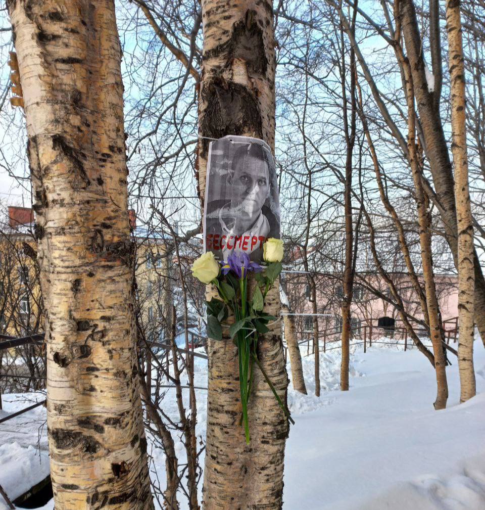 Портрет Навального, который Нагорных прикрепила к дереву в Мурманске / Фото: телеграм-канал Виолетты Грудиной