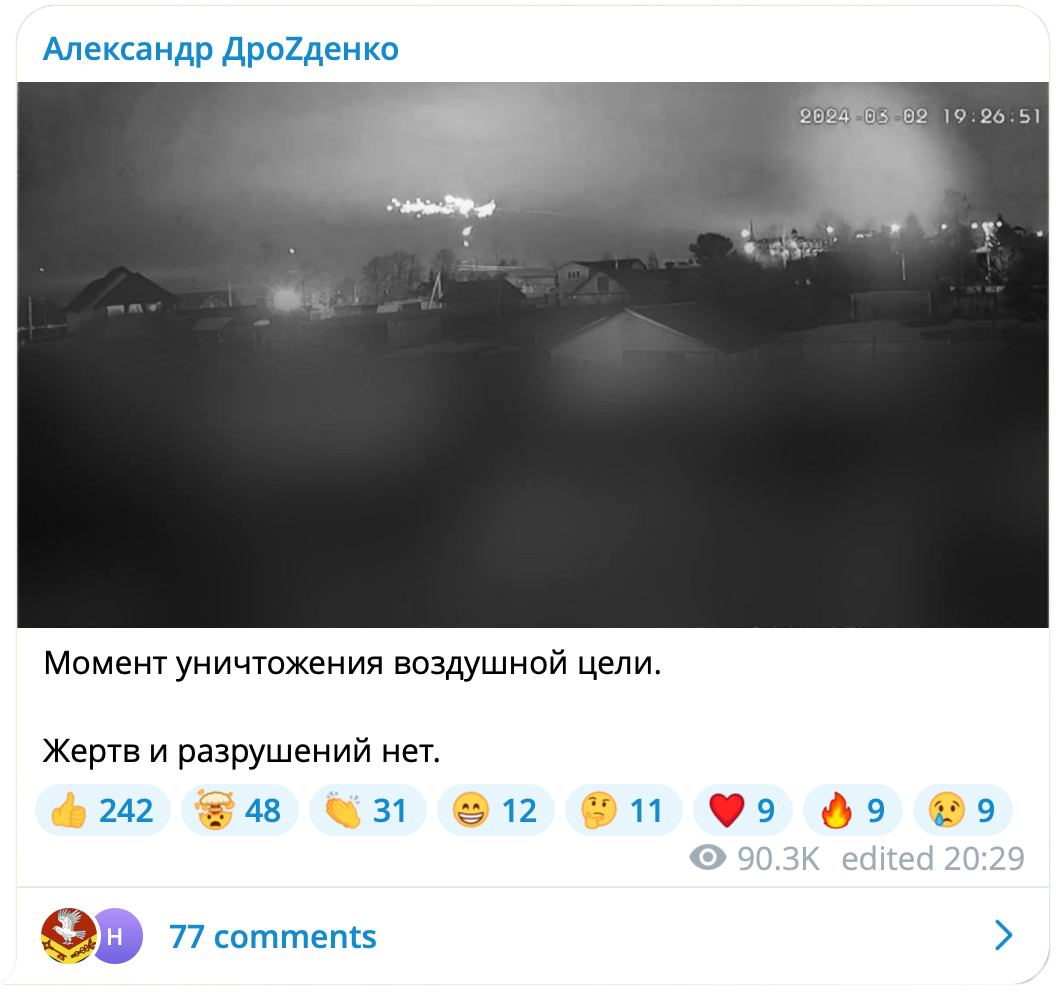 После атаки дронов губернатор Ленинградской области Александр Дрозденко опубликовал в своем телеграм-канале фотографию, на которой, как утверждается, показан «момент уничтожения воздушной цели».