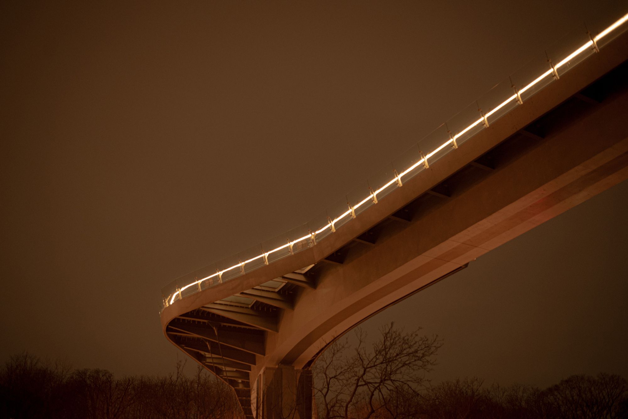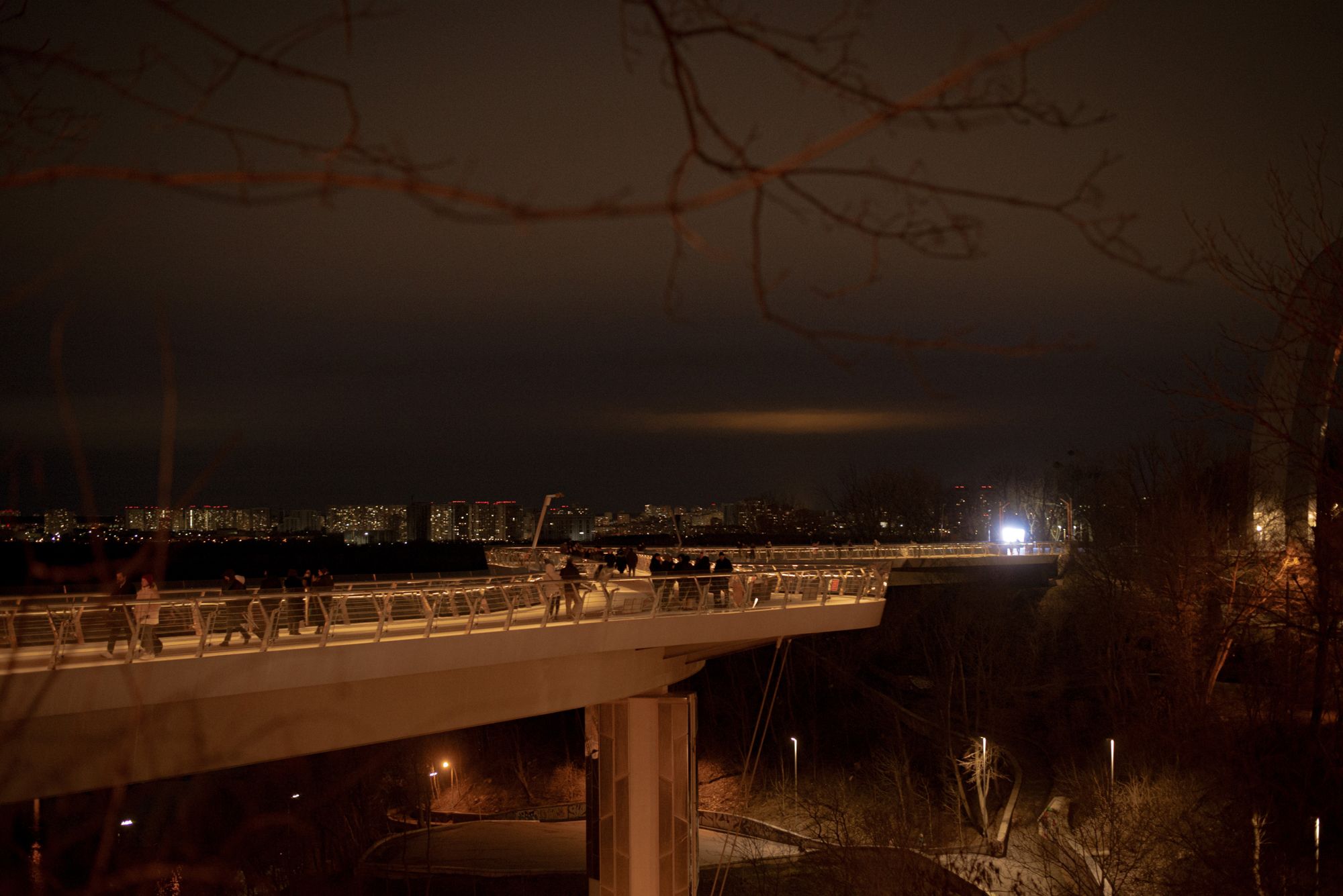 Мост, созданный по проекту архитектора Андрея Миргородского, открылся в 2019 году. Проект называли слишком дорогим, а его создателей обвиняли в неправильном проектировании. Ошибки позже исправили; после удара мост устоял, но лопнули металлические тросы, натянутые вдоль его опор, разбилось стекло на ограждениях. Под мостом от попадания ракеты образовалась воронка. Последствия быстро устранили: уже 17 декабря мост вновь открыли, предварительно обследовав опоры сооружения.